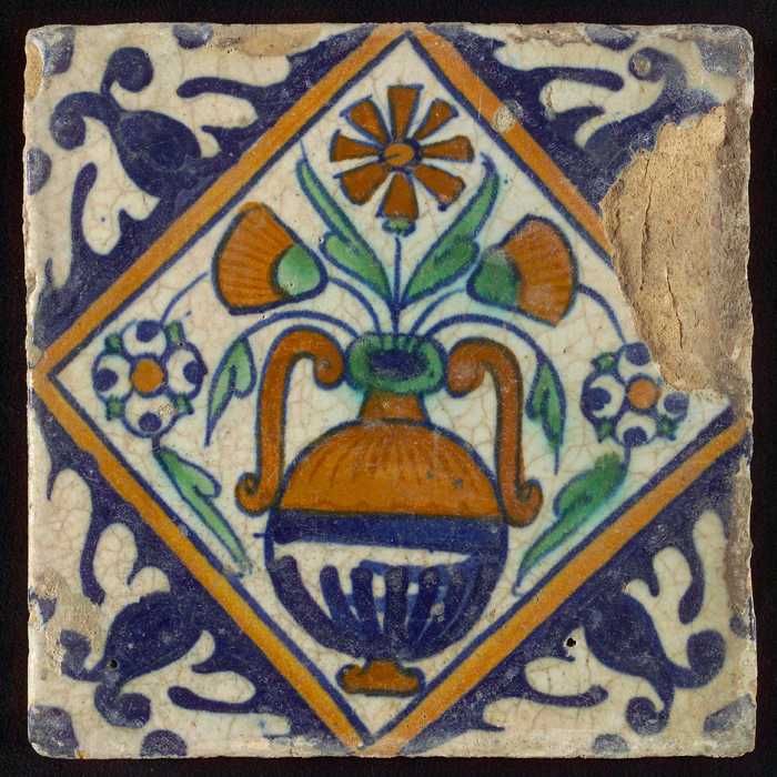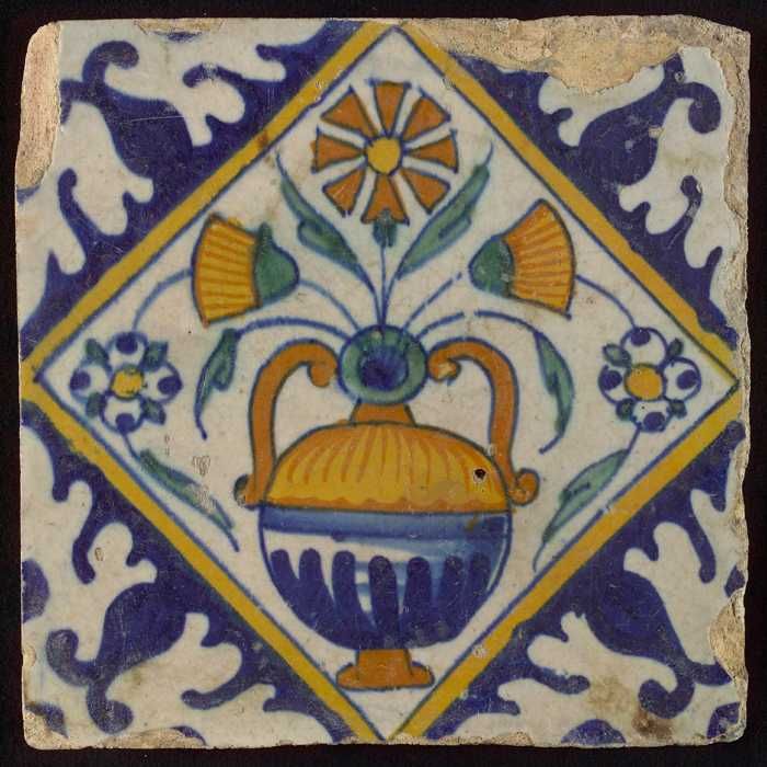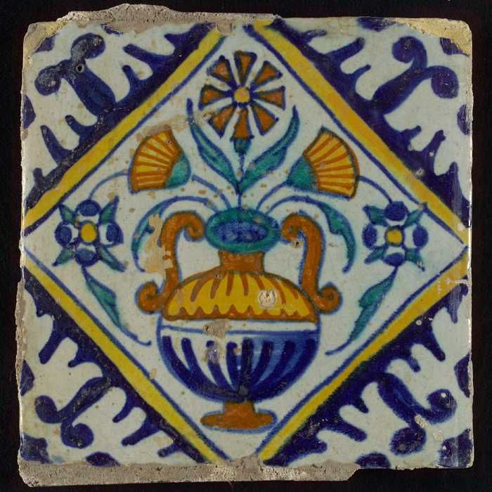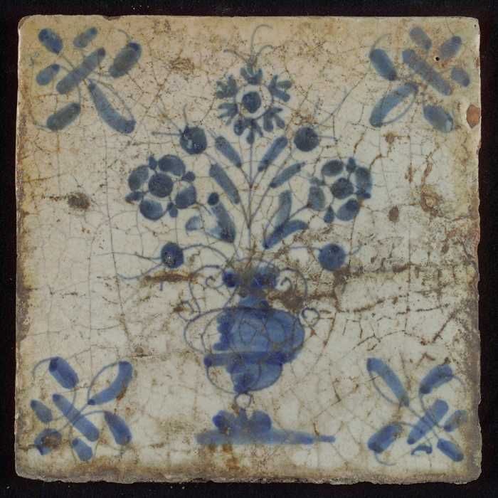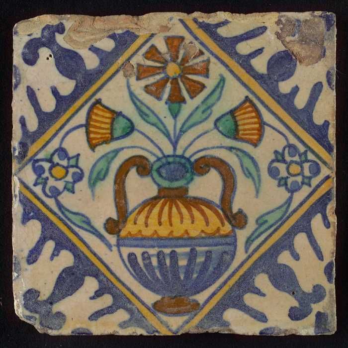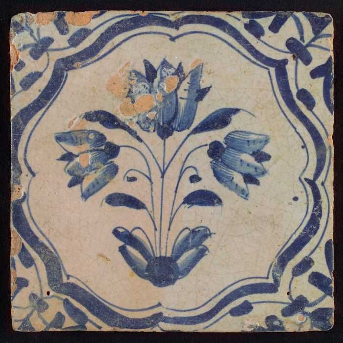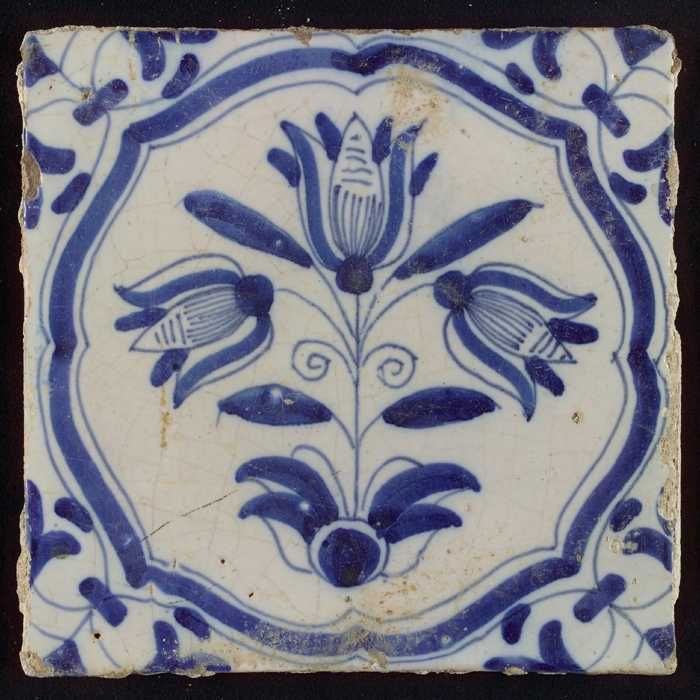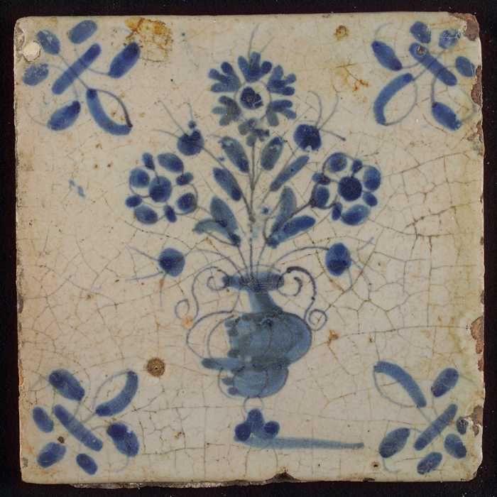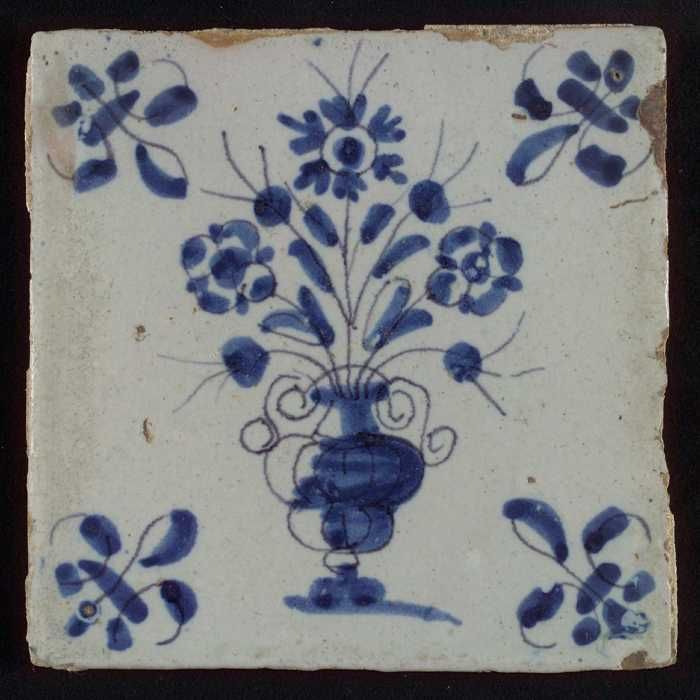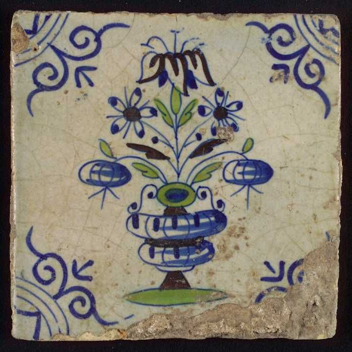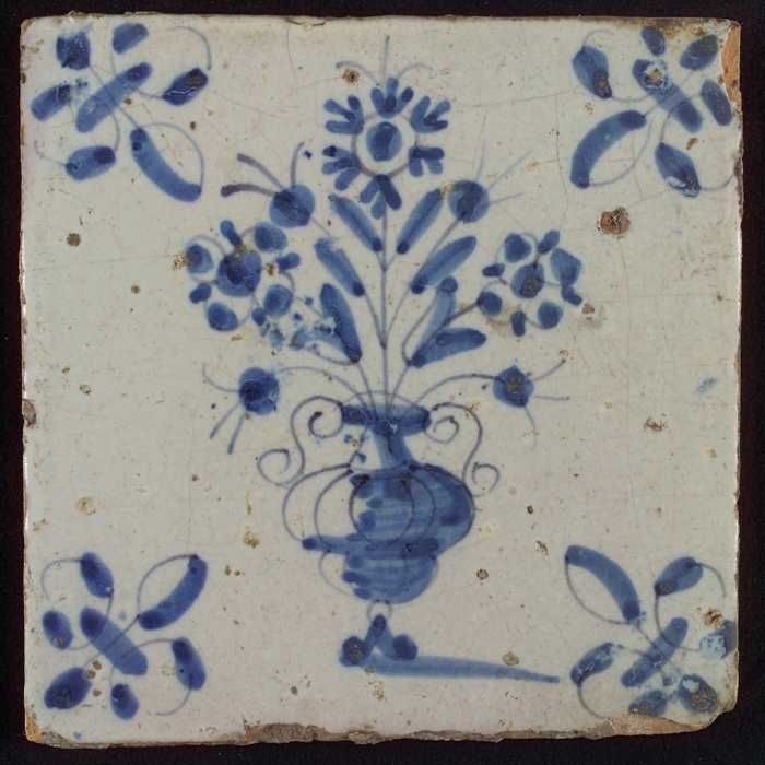 Tegel, bloempot in blauw op wit, hoekmotief gespaakt...