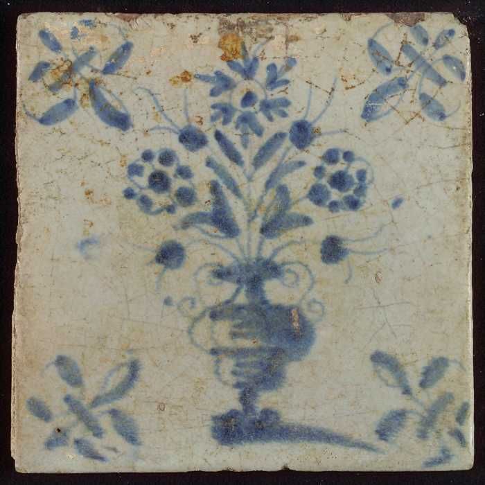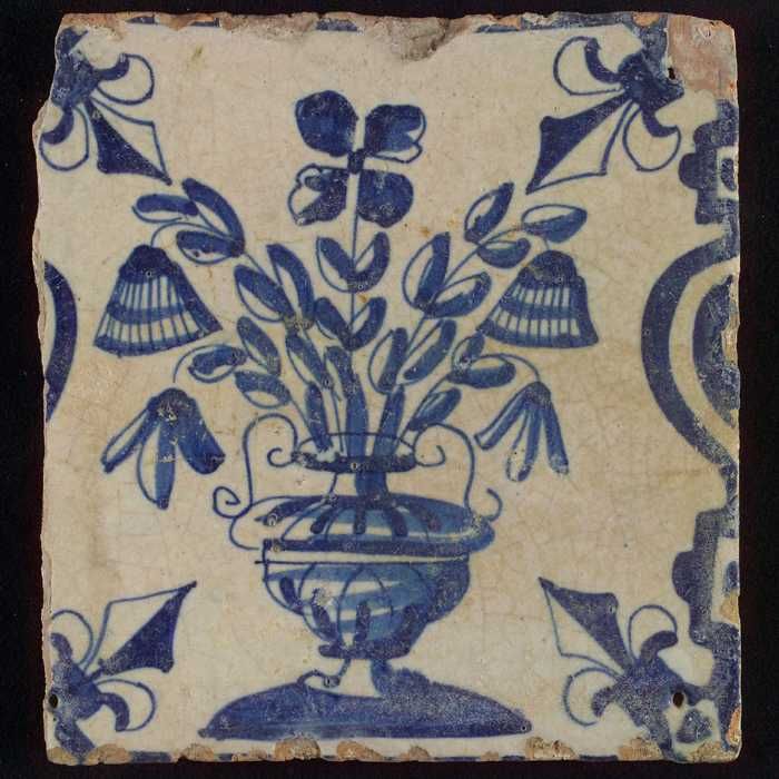 Tegel, bloempot in blauw op wit, hoekmotief franse l...