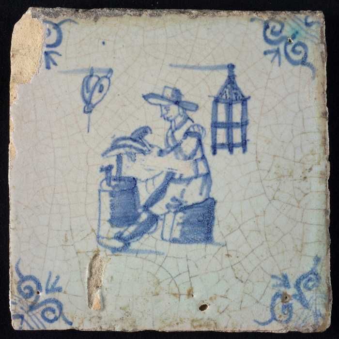 Figuurtegel, blauw, marskramer met mand, hoekmotief ...