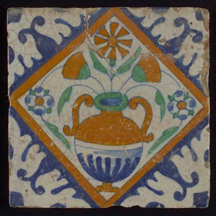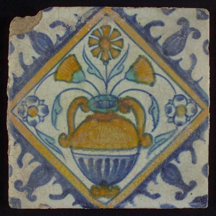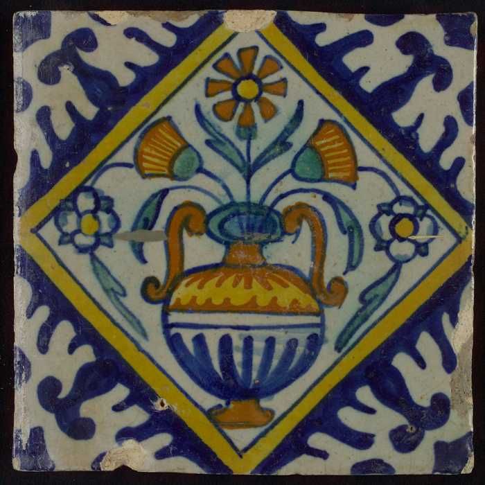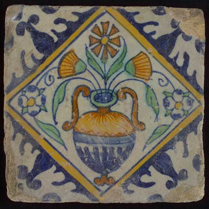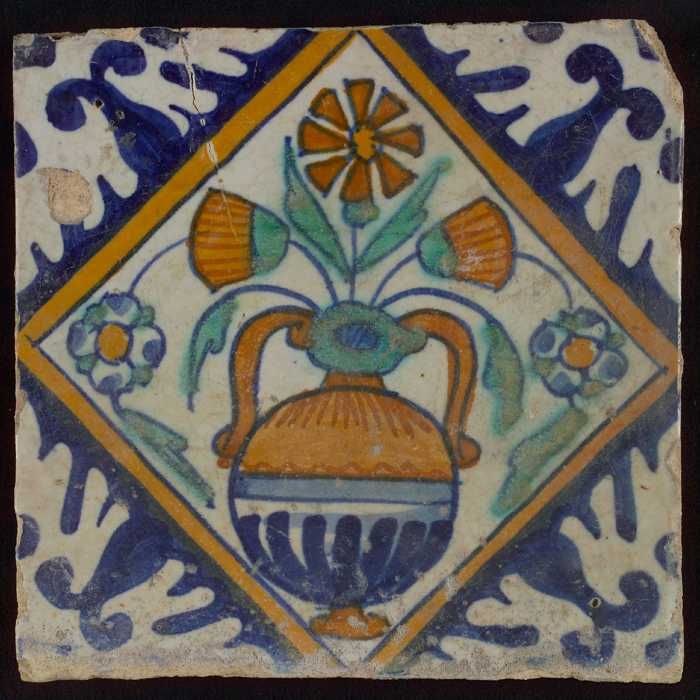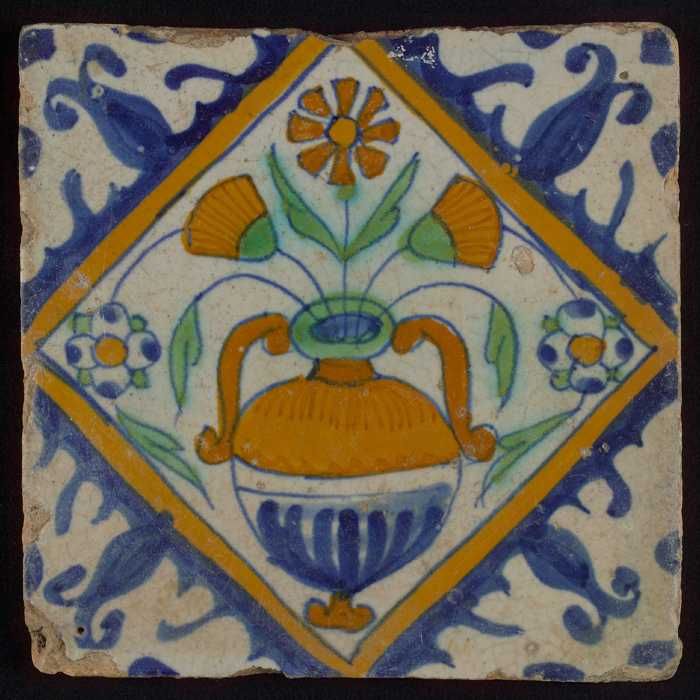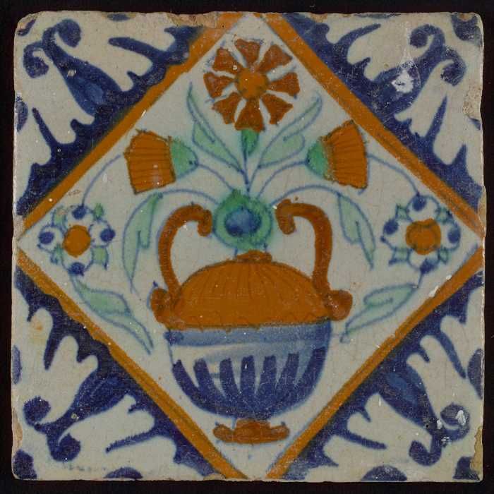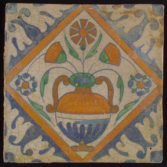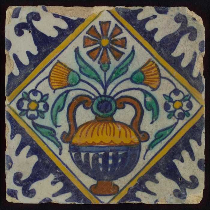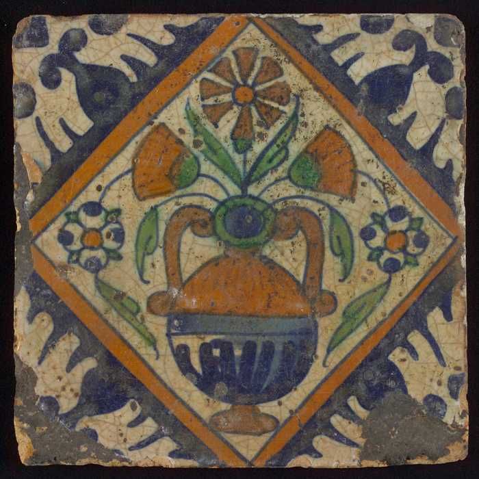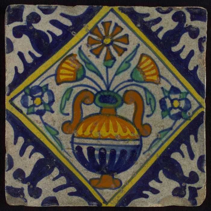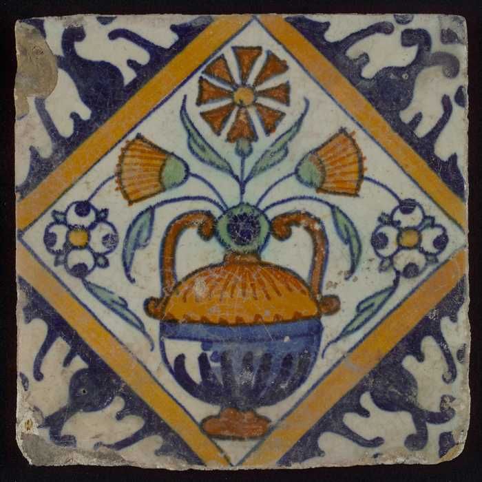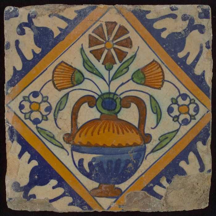 Bloemtegel, bloempot in kwadraat, hoekmotief palmet