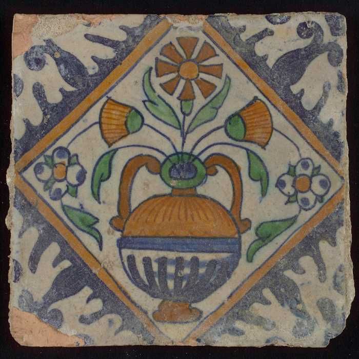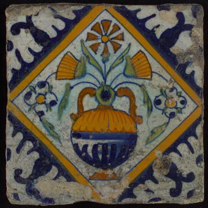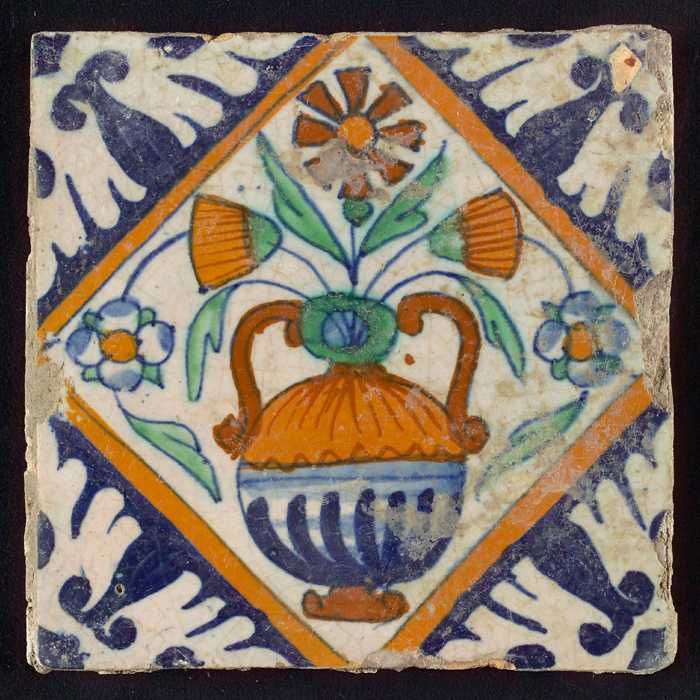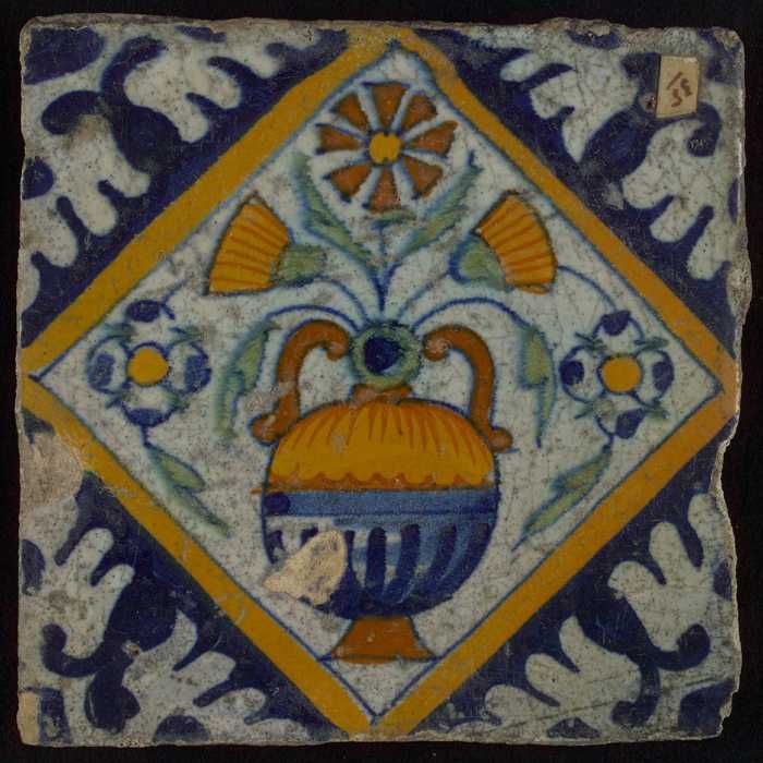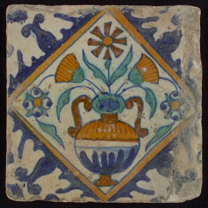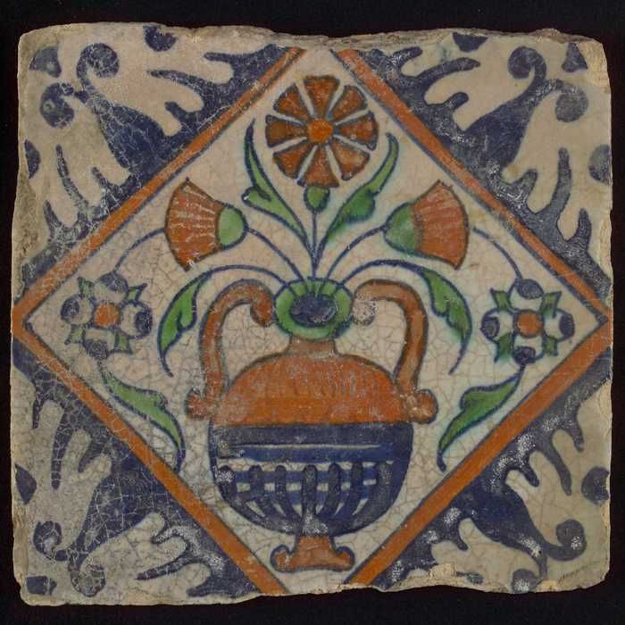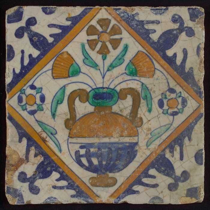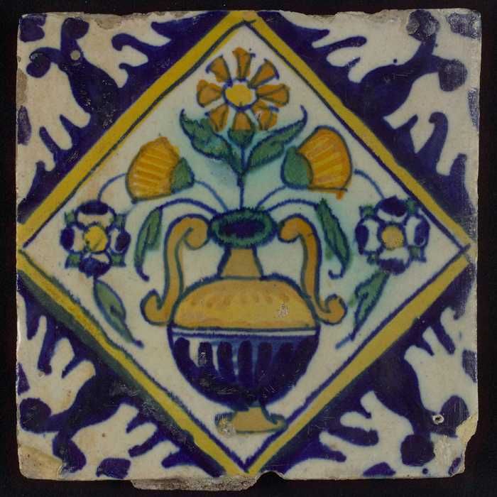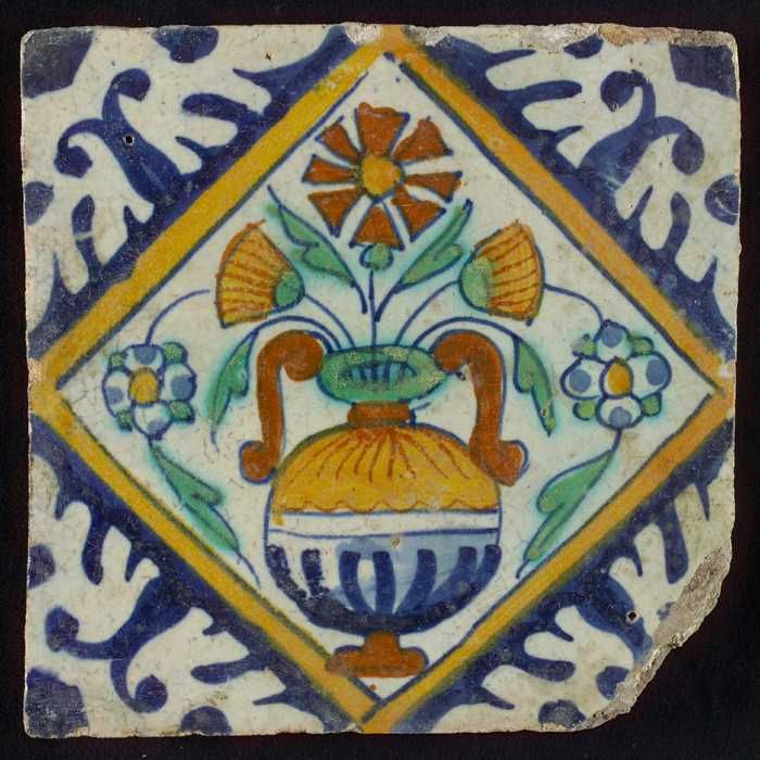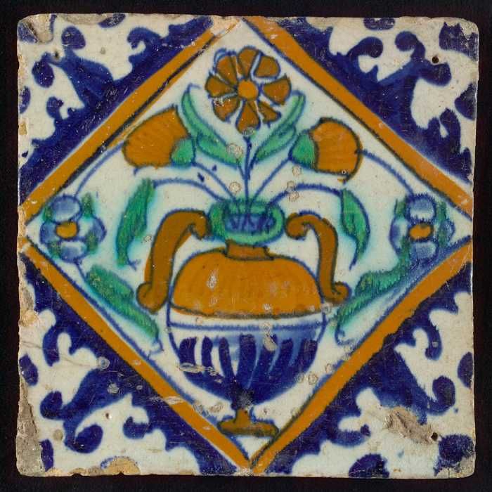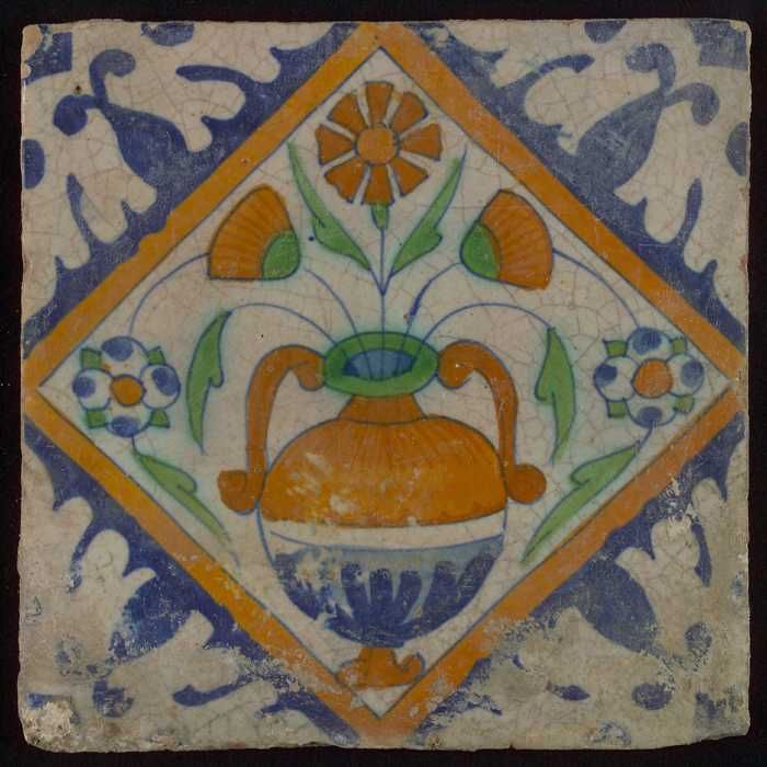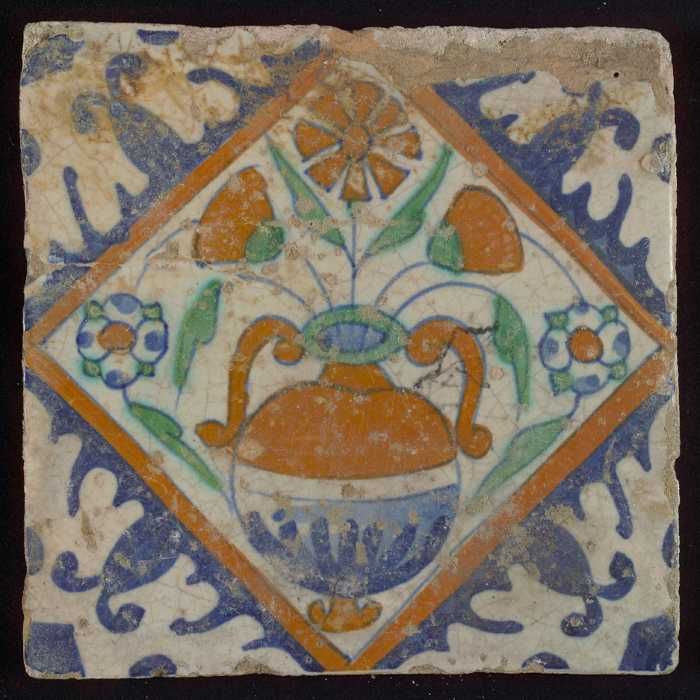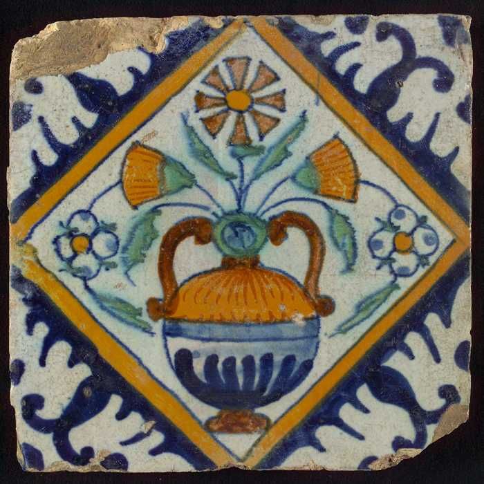 Bloemtegel, bloempot in kwadraat, hoekmotief palmet