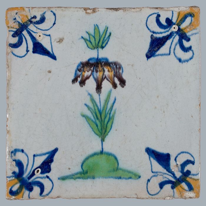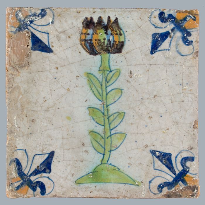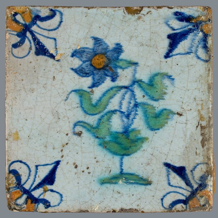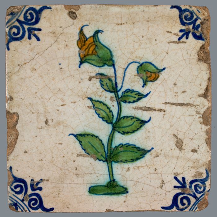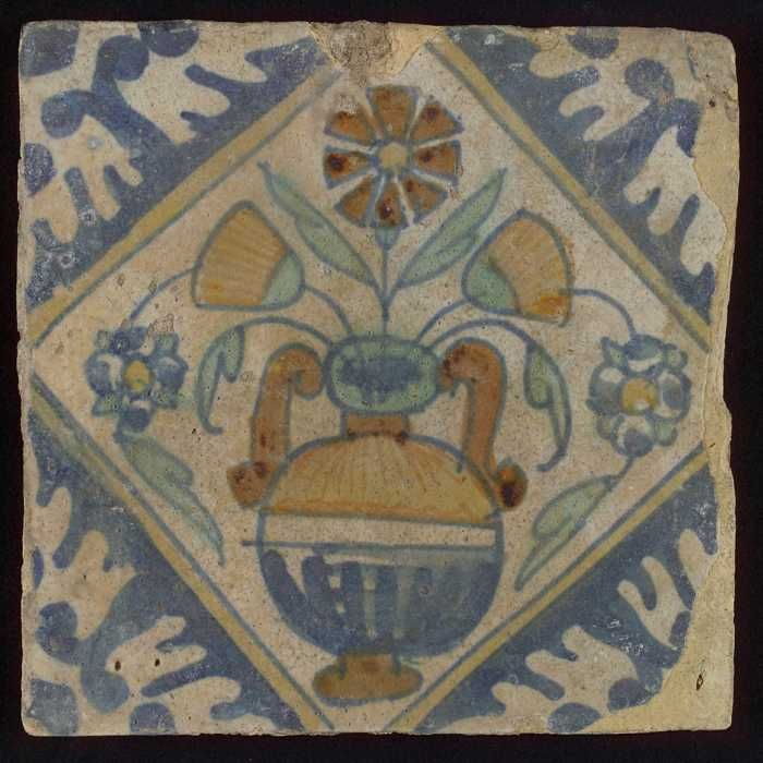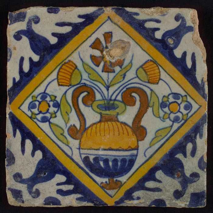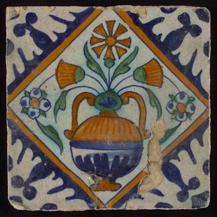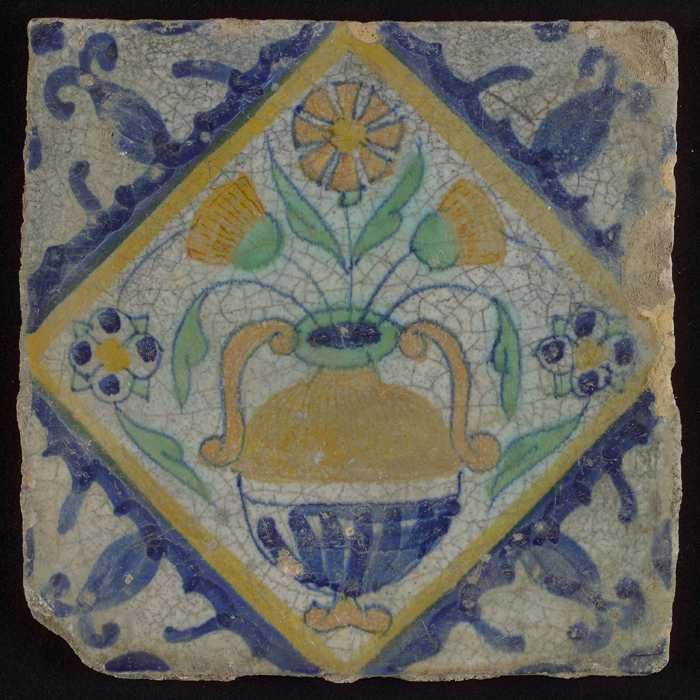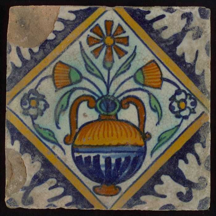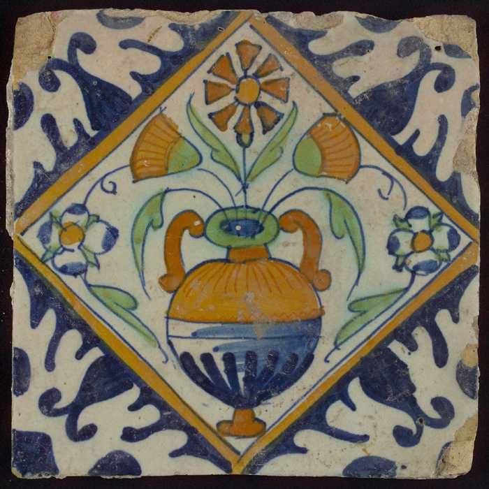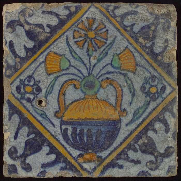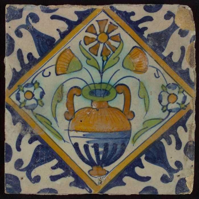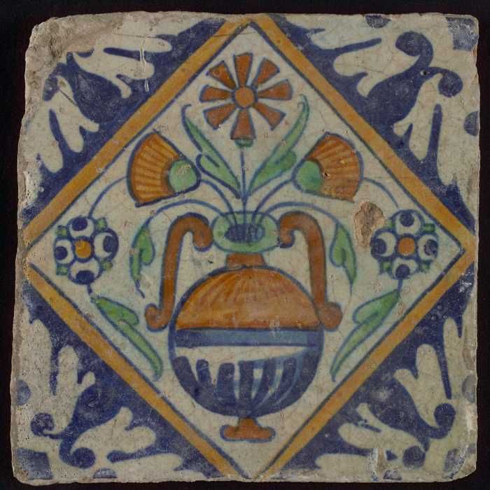 Bloemtegel, bloempot in kwadraat, hoekmotief palmet