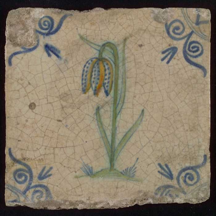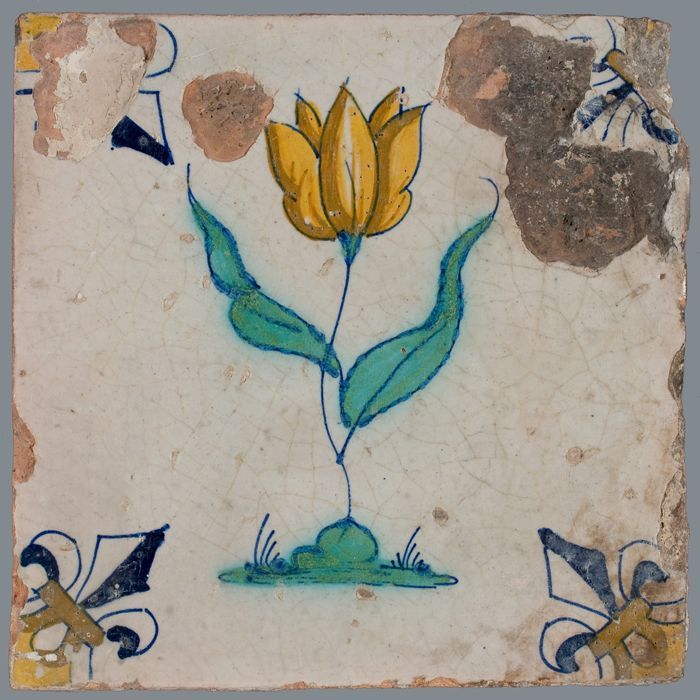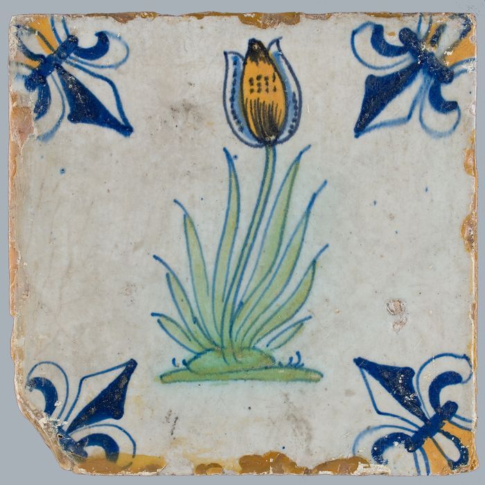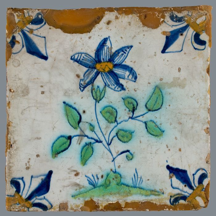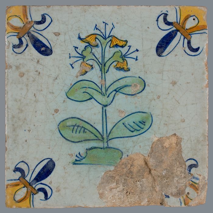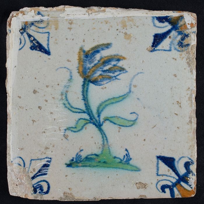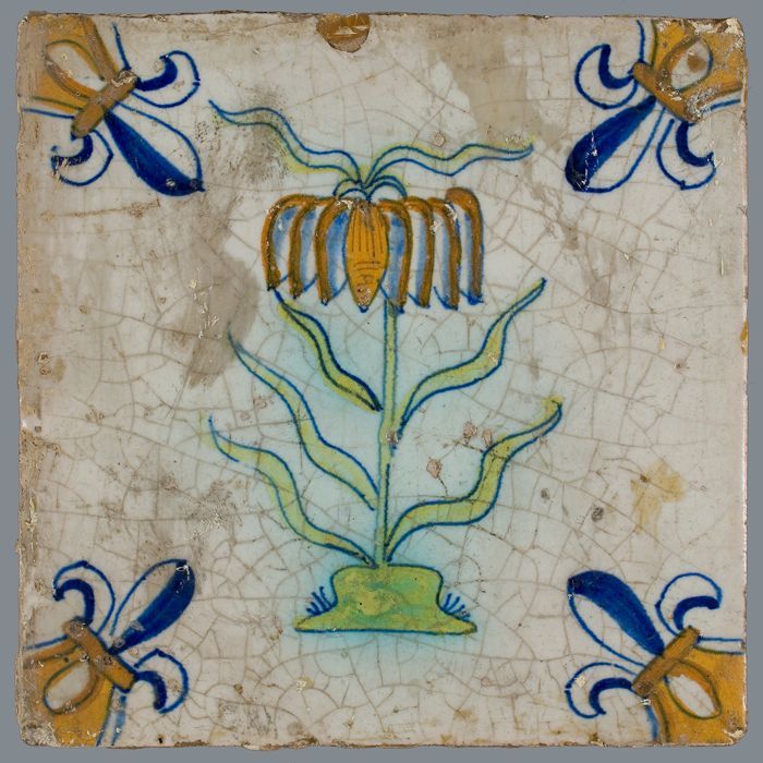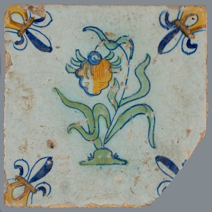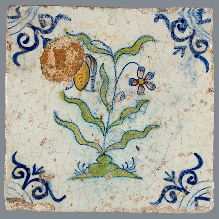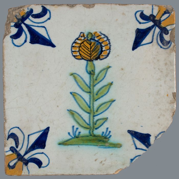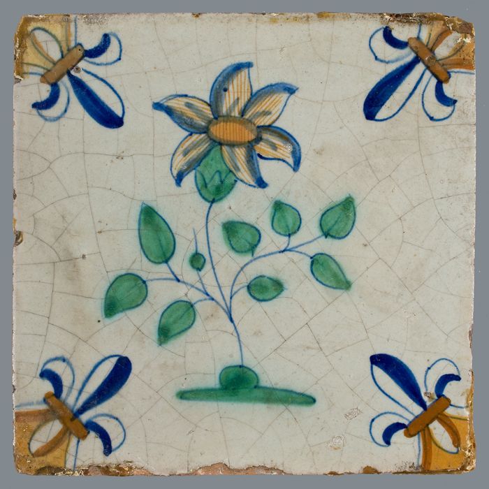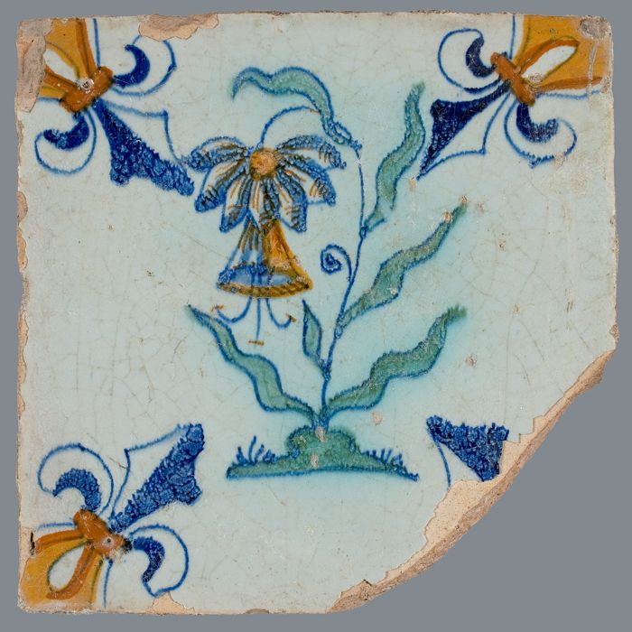 Tegel, bloem op grondje in geel, bruin, groen en bla...