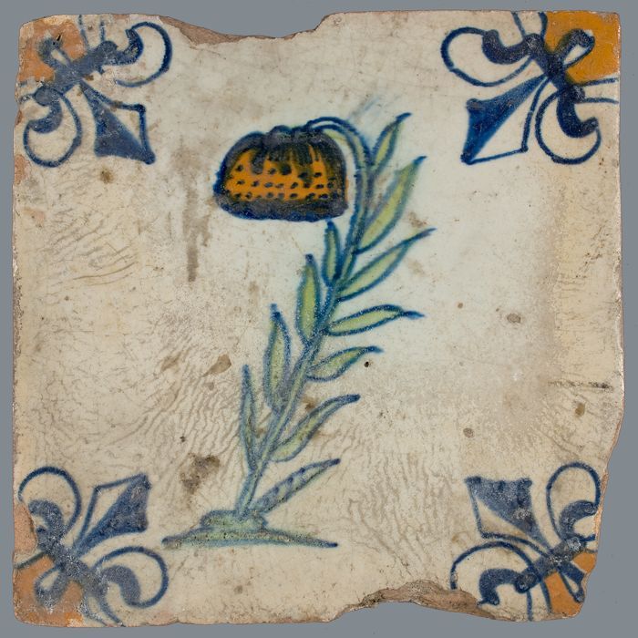 Tegel, bloem op grondje in oranje, bruin, geel, groe...