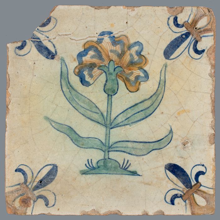 Tegel, bloem op grondje in oranje, groen en blauw op...