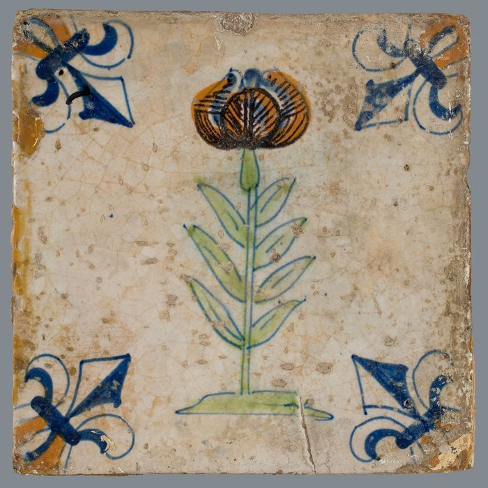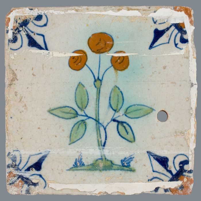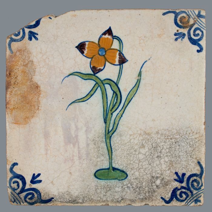 Tegel, bloem op grondje in oranje, bruin, groen en b...