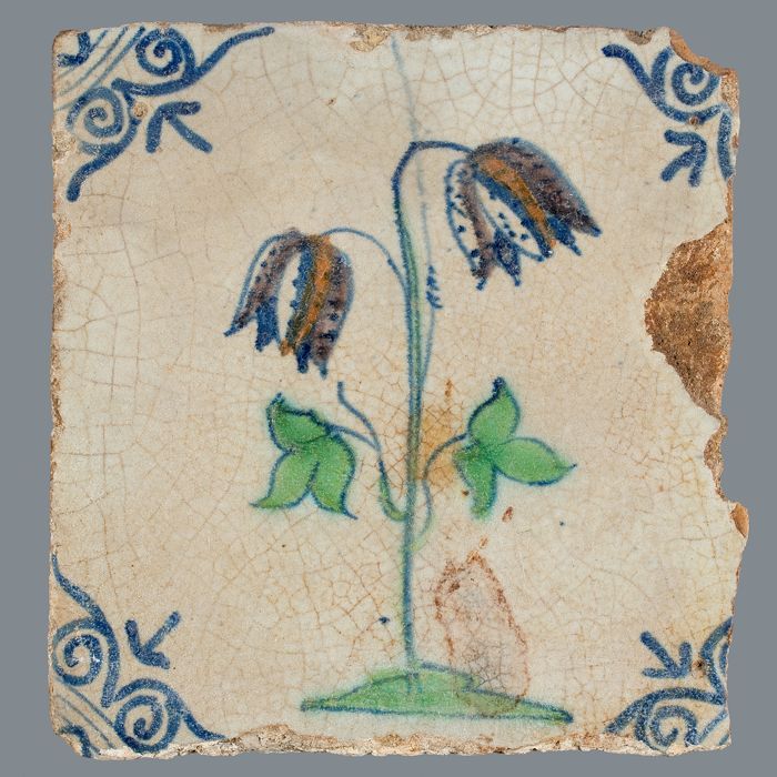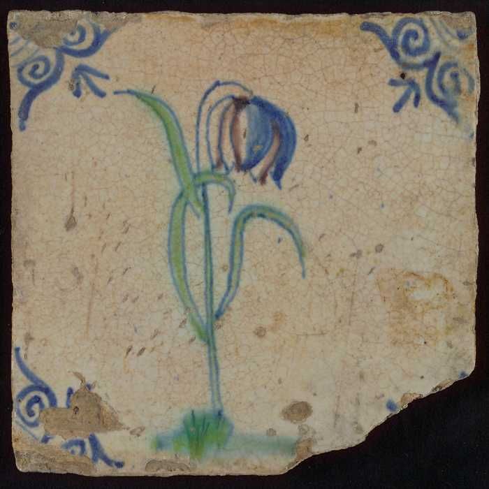 Tegel, bloem op grondje in paars, groen en blauw op ...