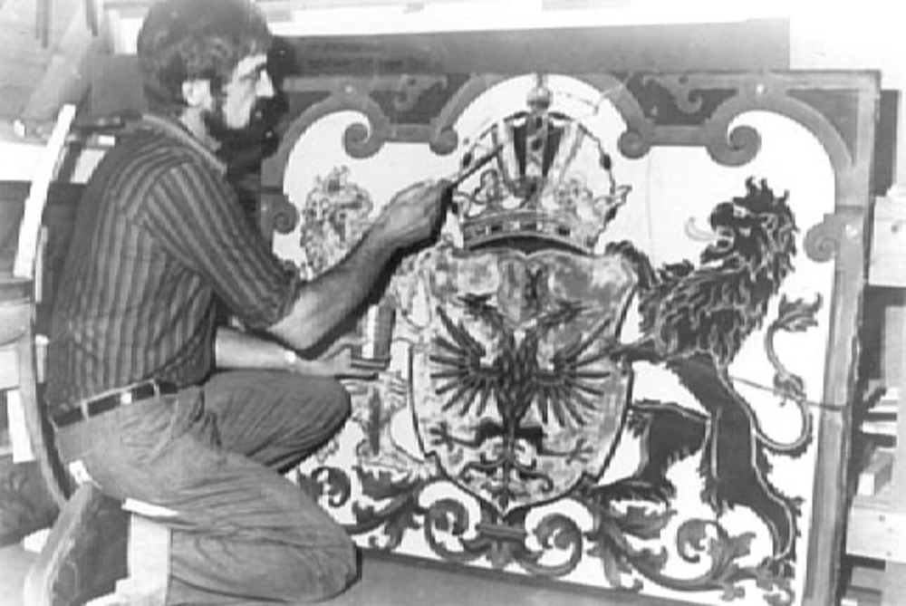Museummedewerker Toon Wakker restaureert een plakett...