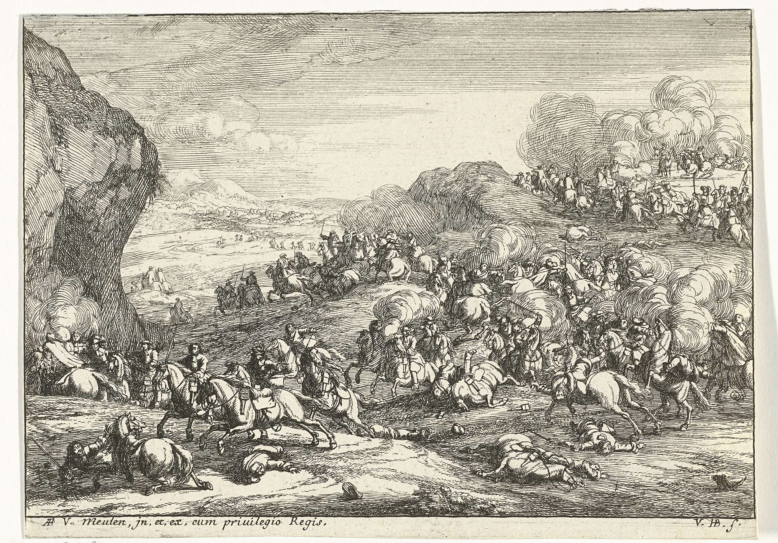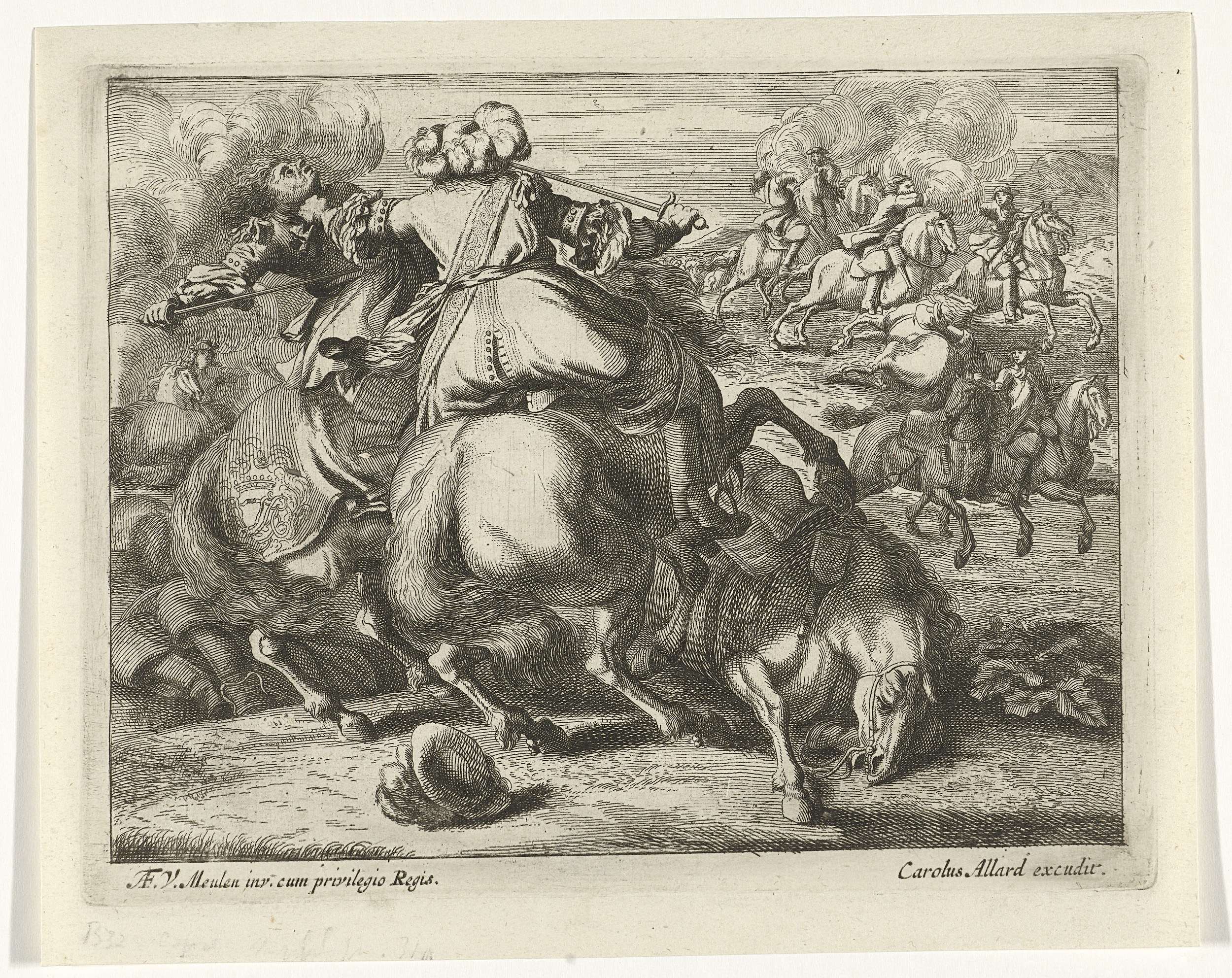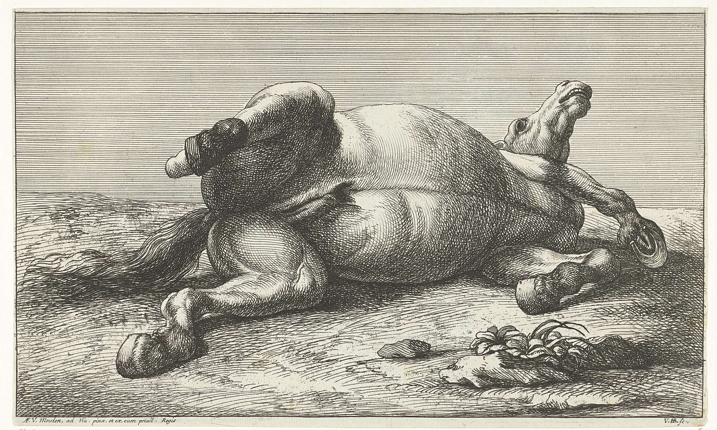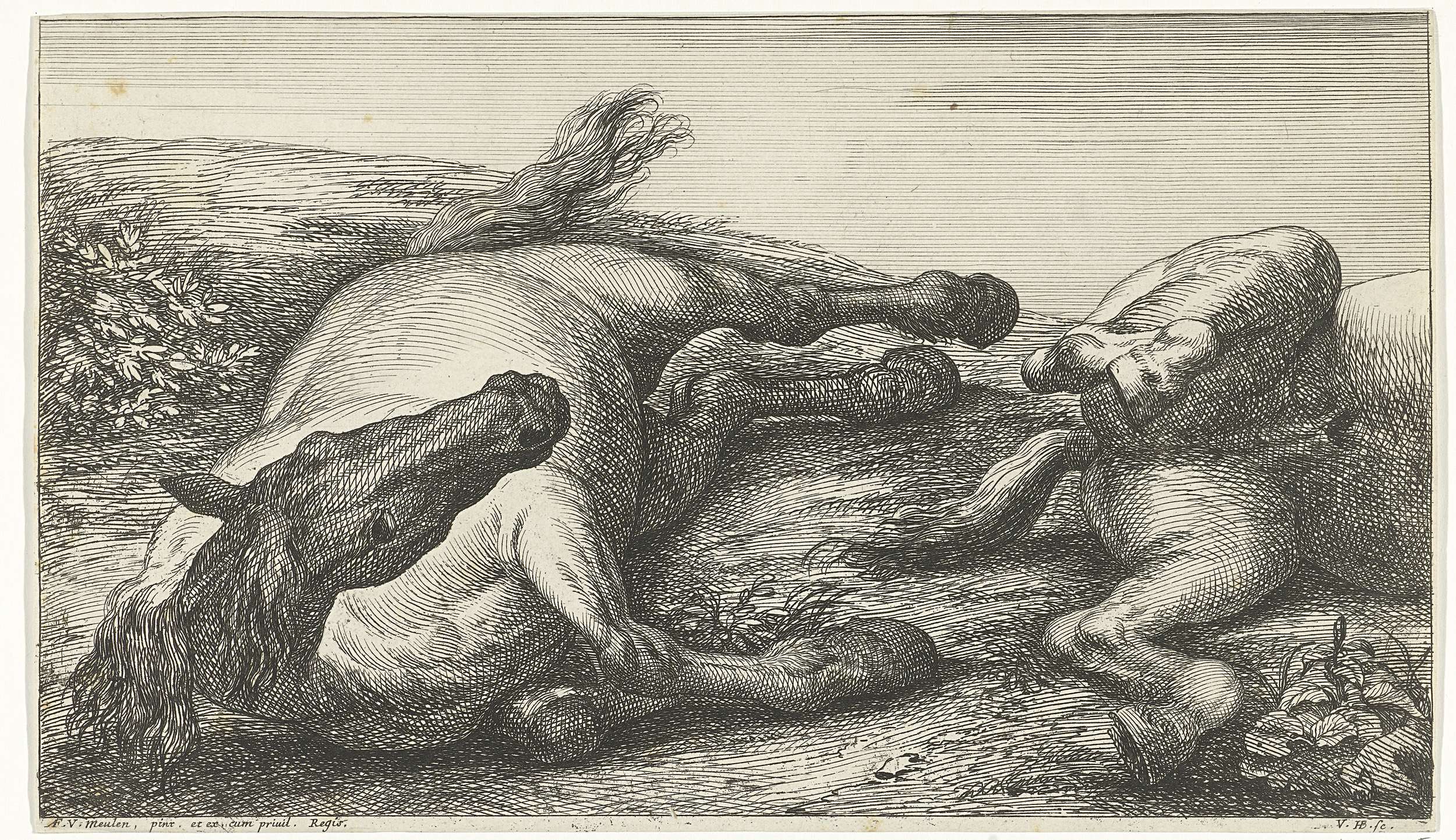 Twee gesneuvelde paarden waarvan de rechter van de z...