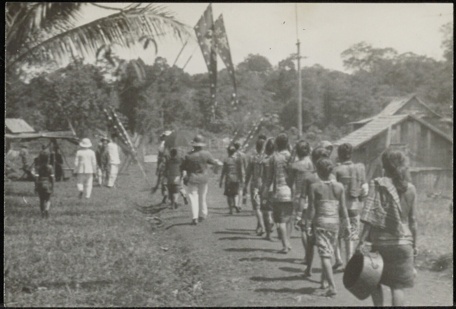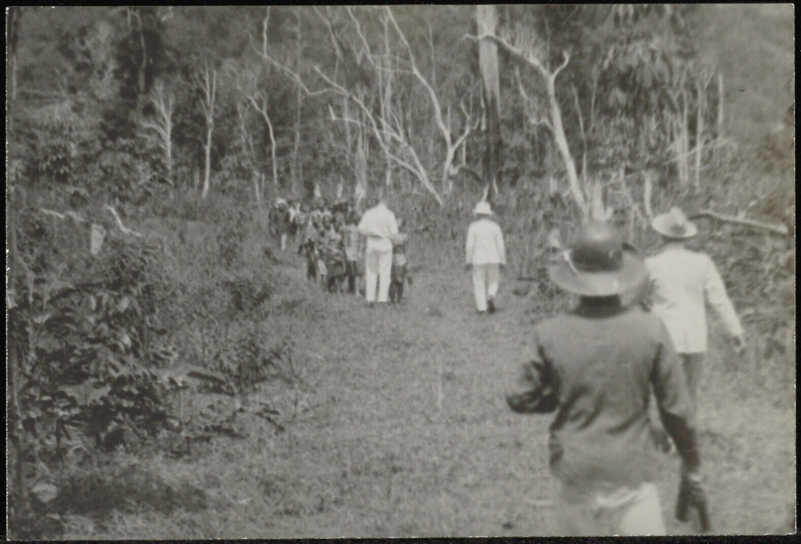 Europeanen en leden van de inheemse bevolking in bos...