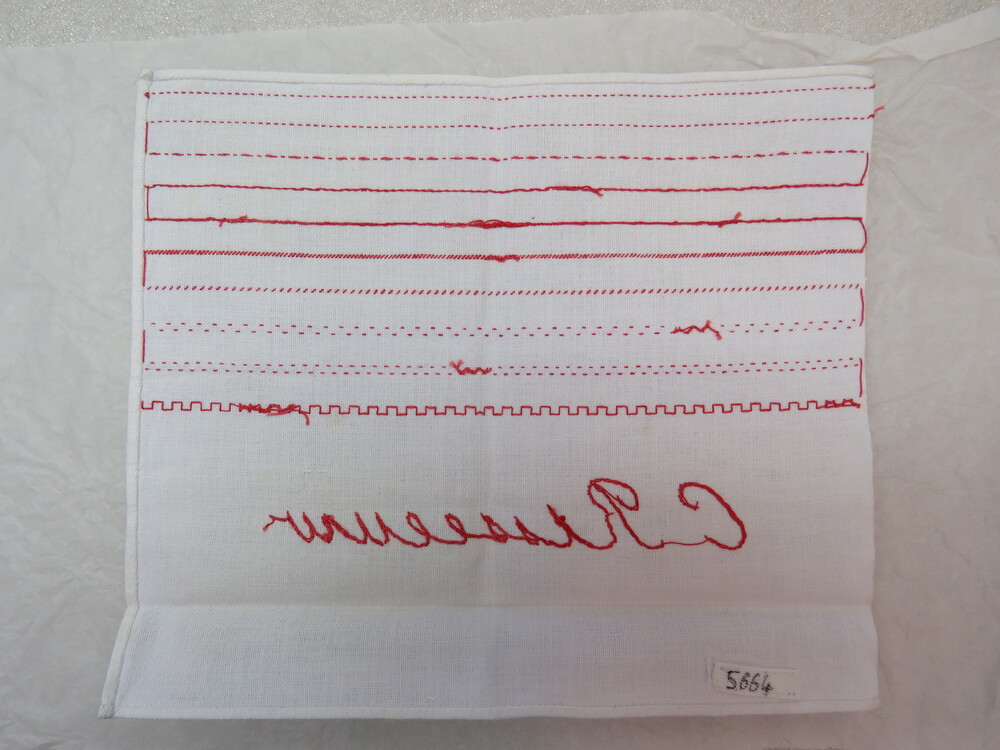 proeflap van linnen met rood garen, gesigneerd, C. R...