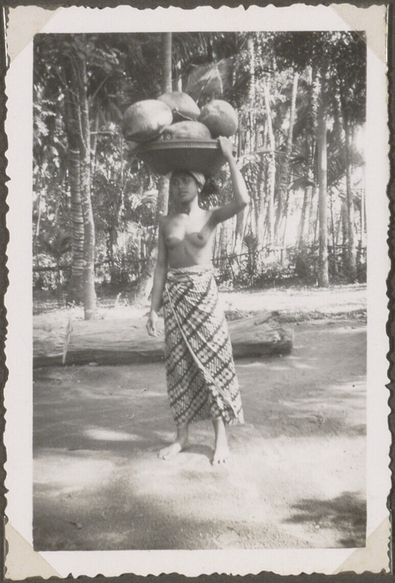 Balinese vrouw met draagmand gevuld met kokosnoten