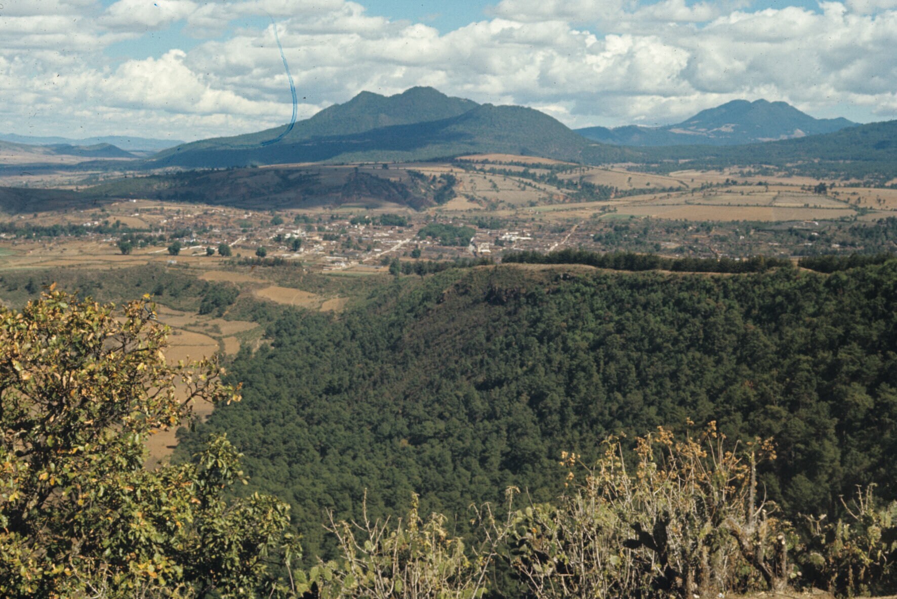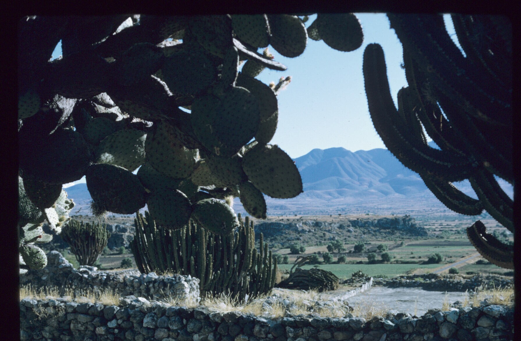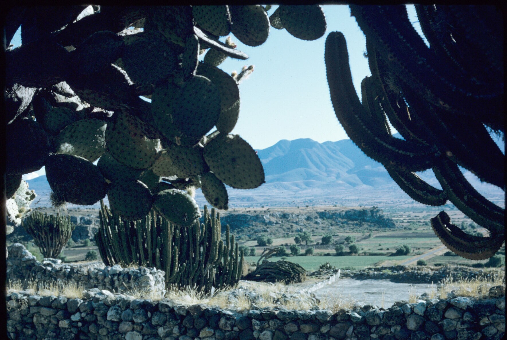 Vallei van Oaxaca vanuit Yagul, met opuntia's (nopal...