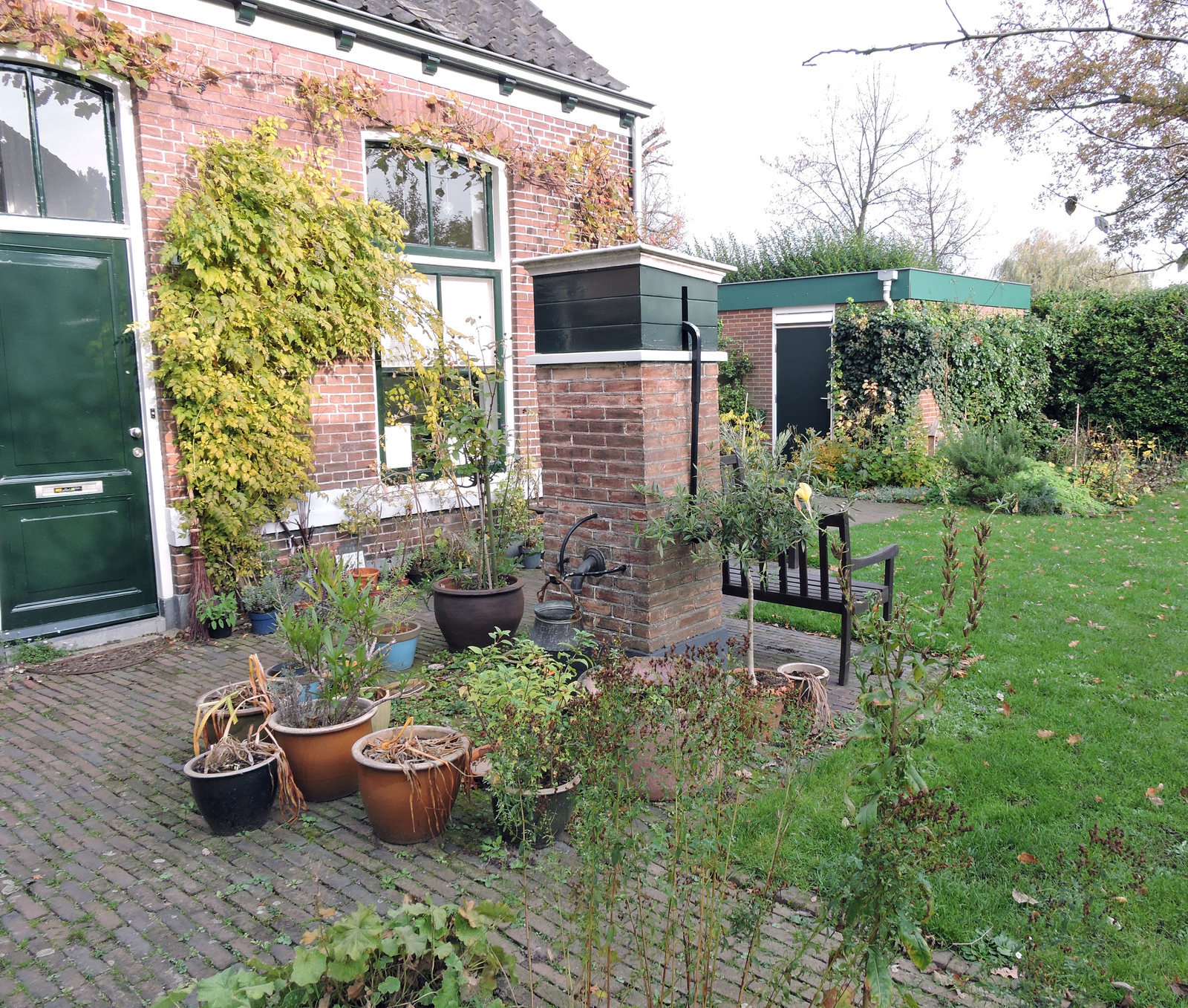 Gemetselde waterpomp met houten vlakke bovenkant op ...
