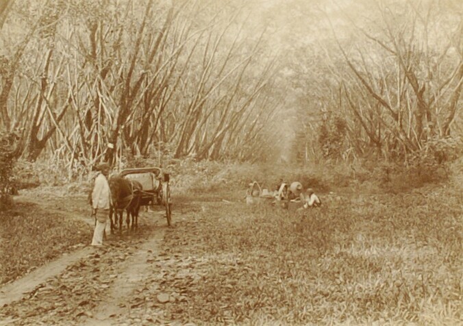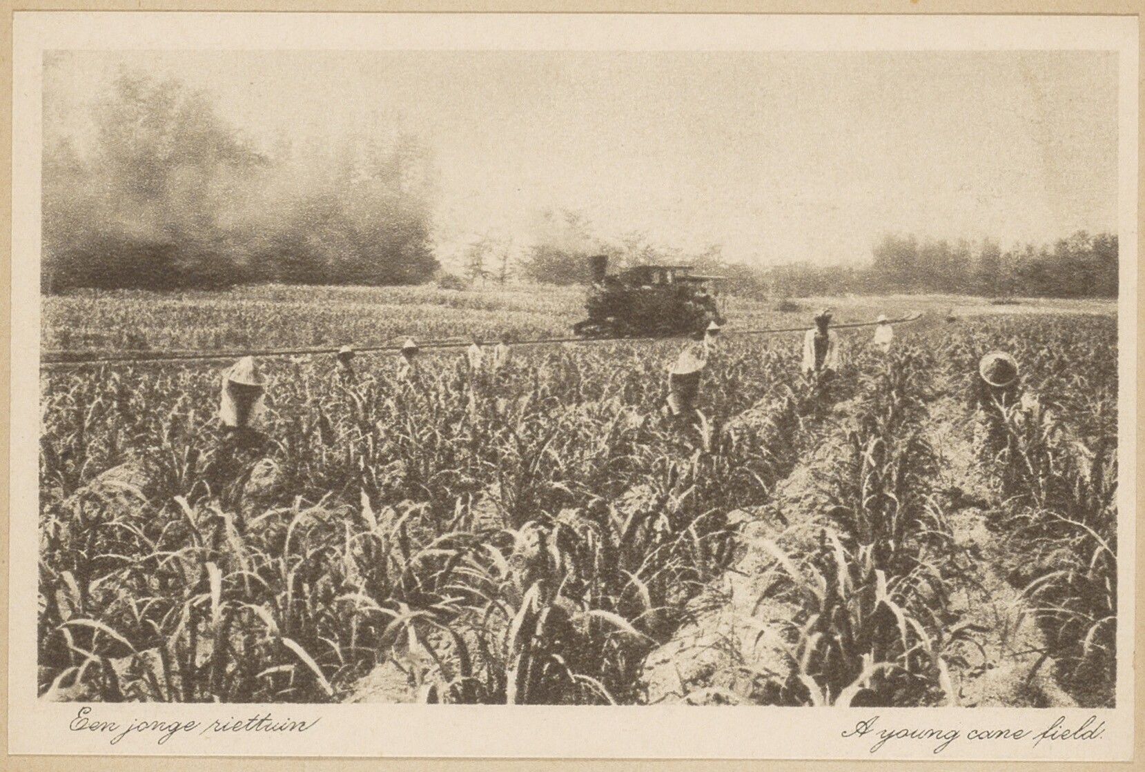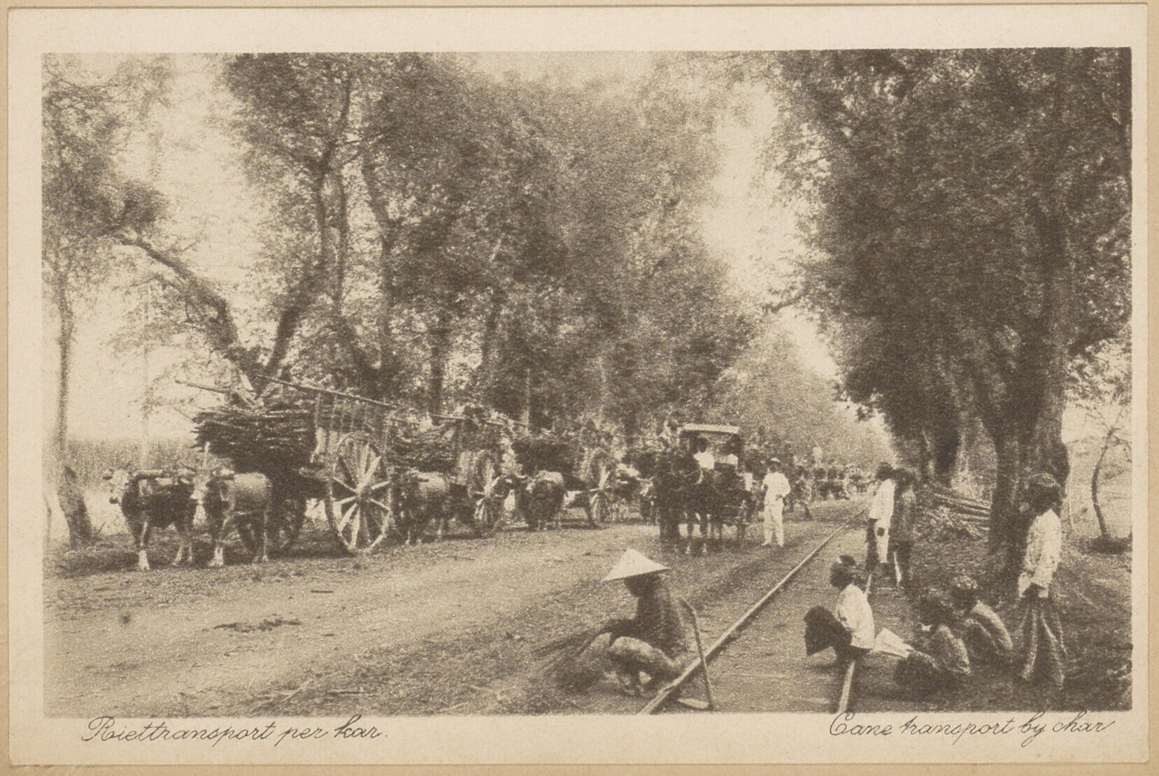 Ossenkarren met riet en Javaanse arbeiders