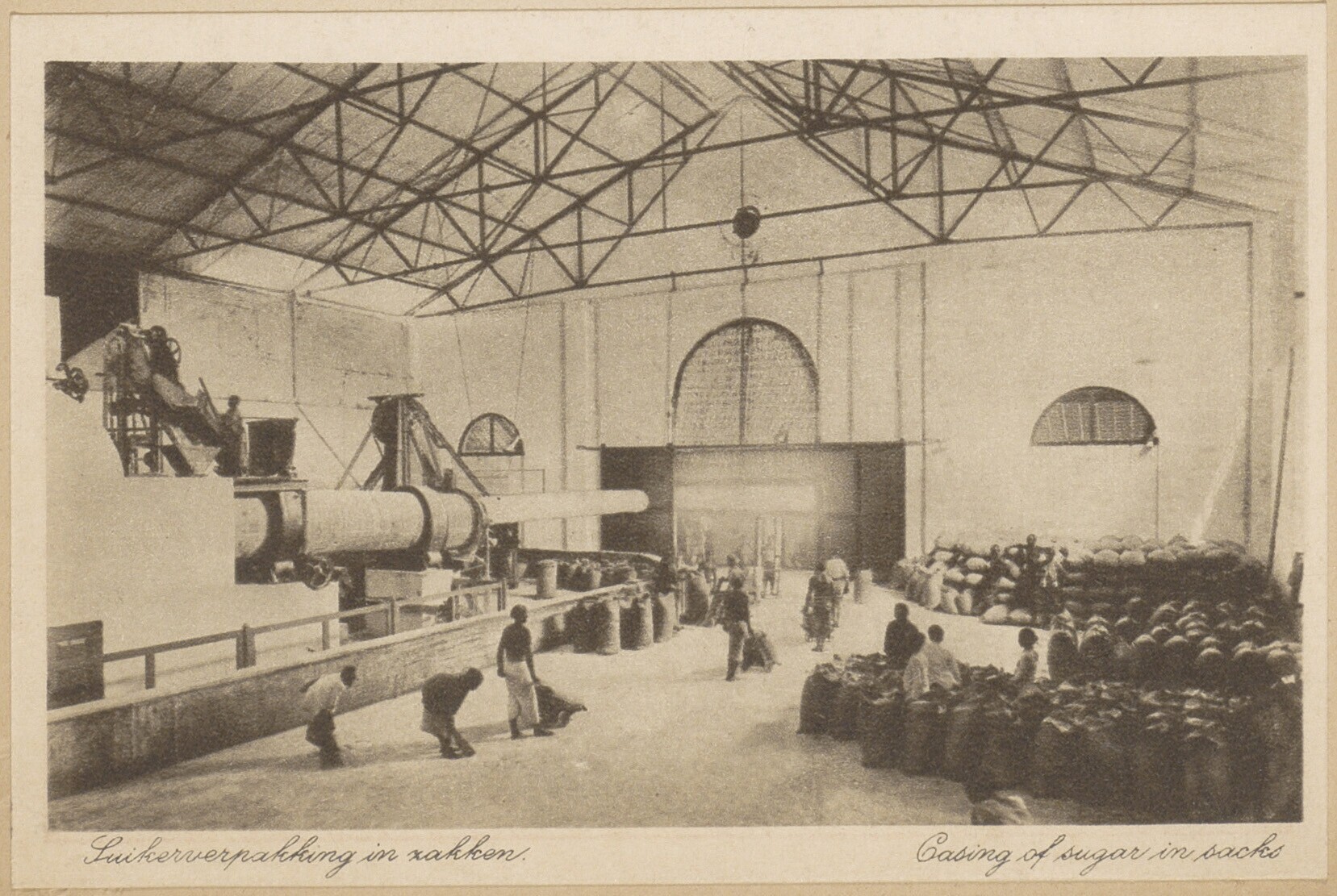 Arbeiders aan het werk in een suikerfabriek op Java