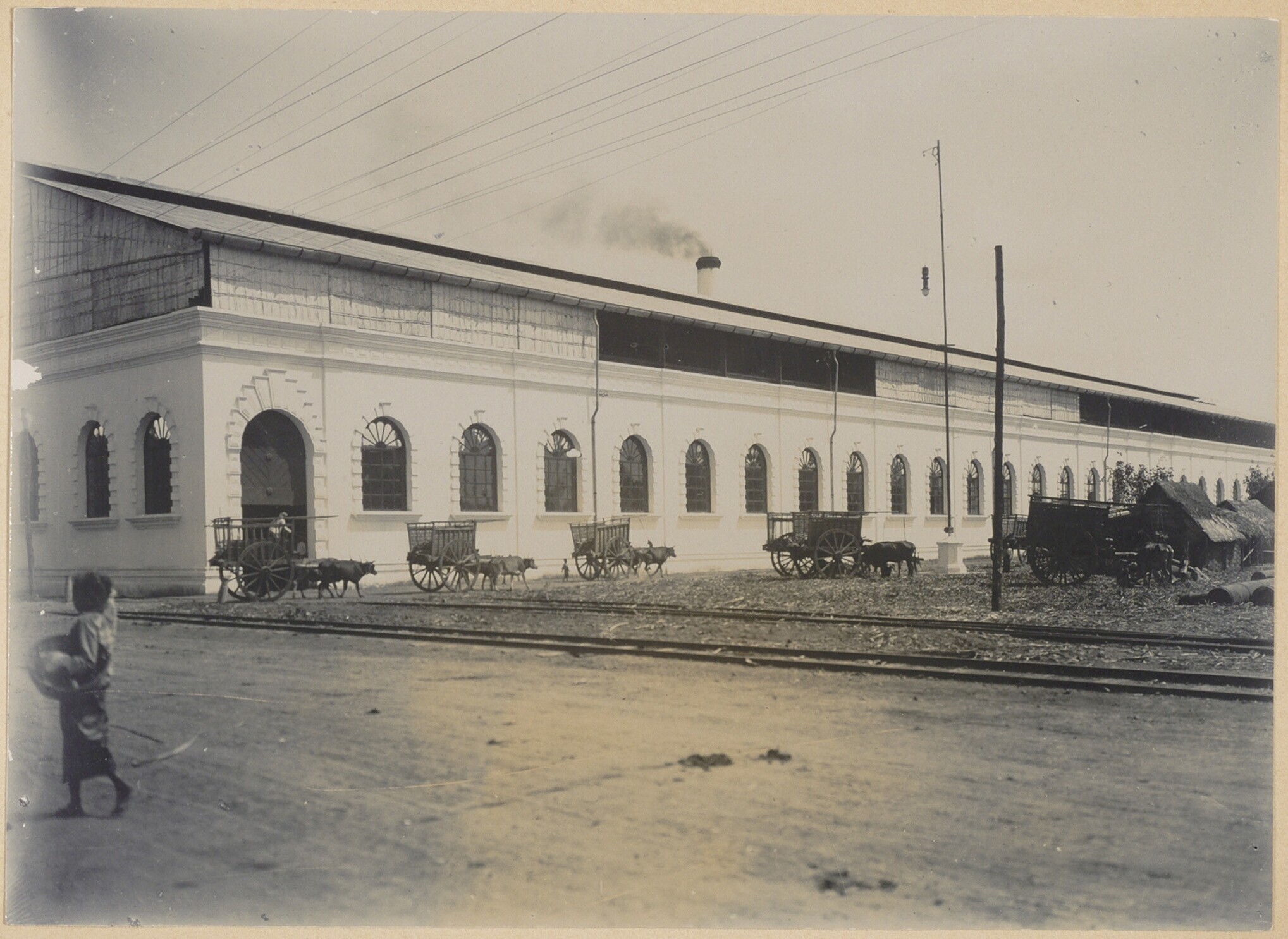 Hal van een suikerfabriek op Java met ossenwagens er...