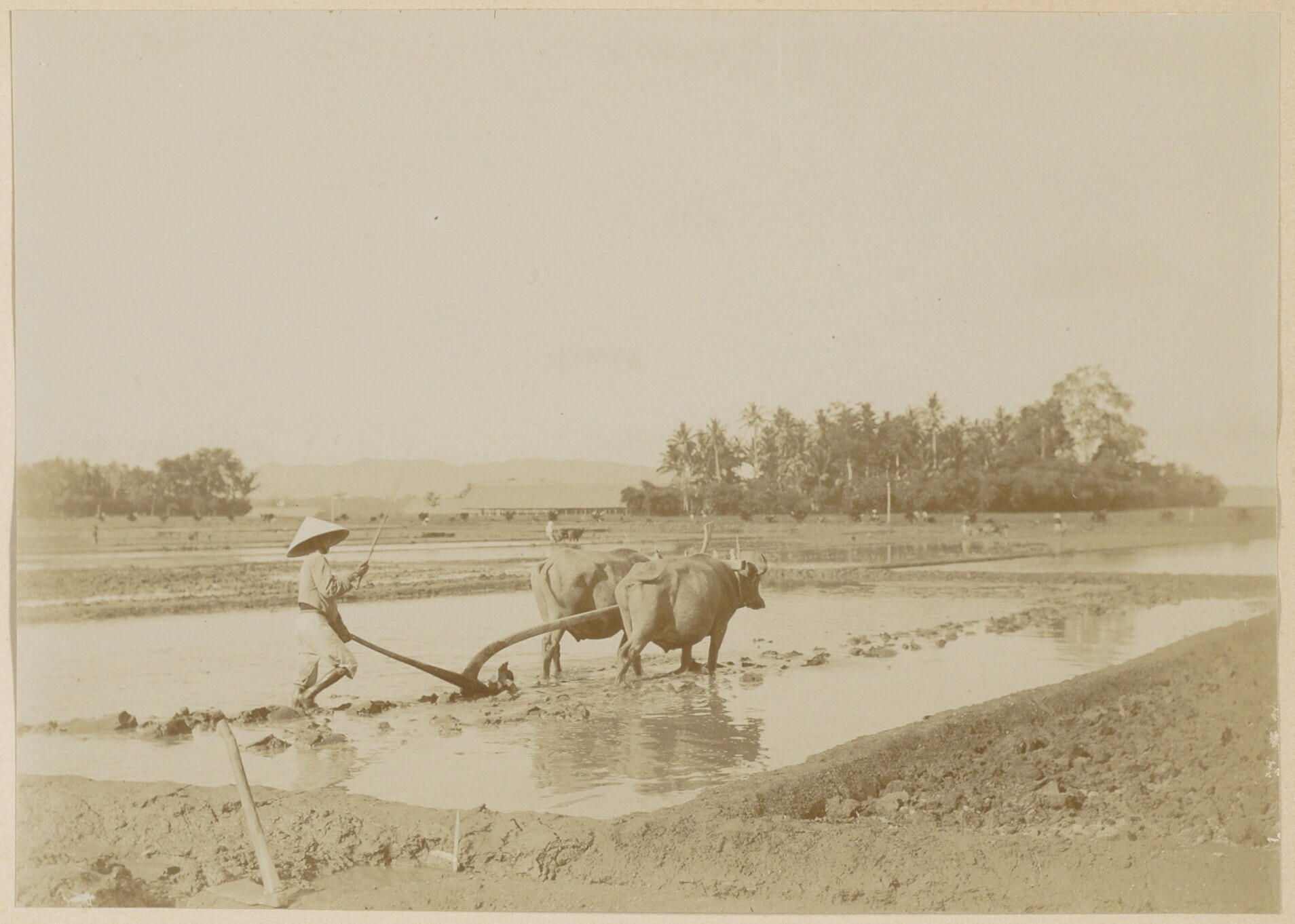 Javaanse arbeider met twee runderen op een rijstveld...