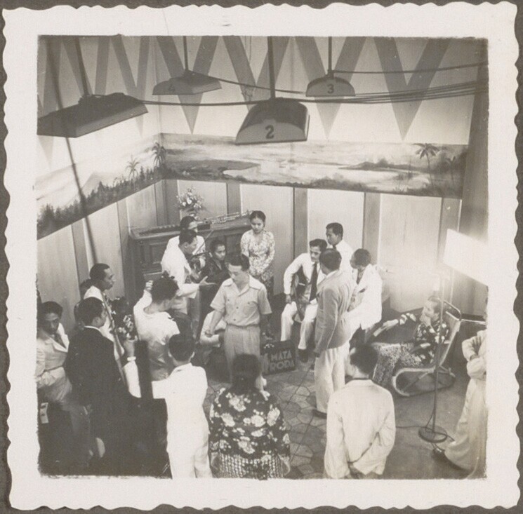 Javaanse arbeiders rijgen tabaksbladeren in een loods