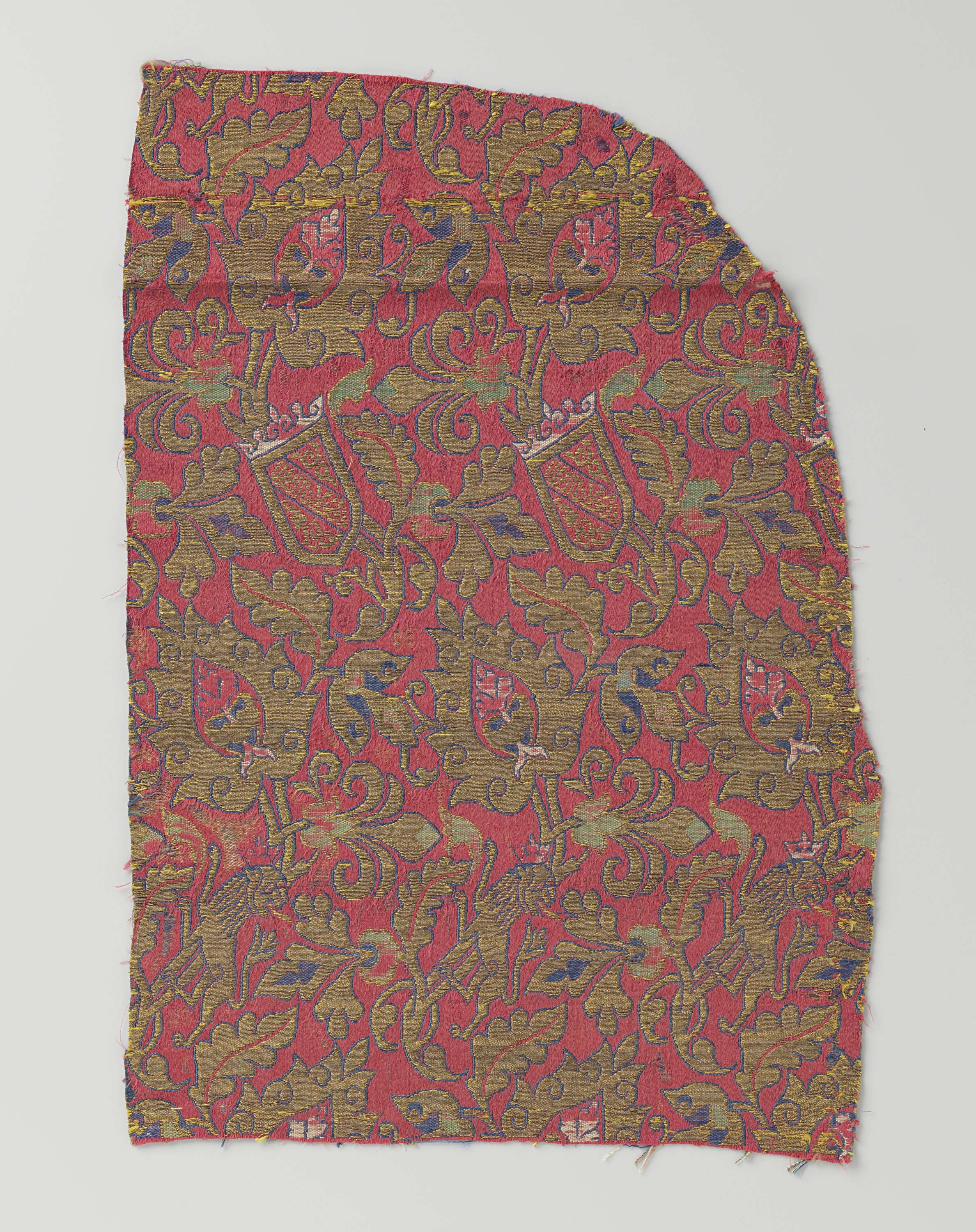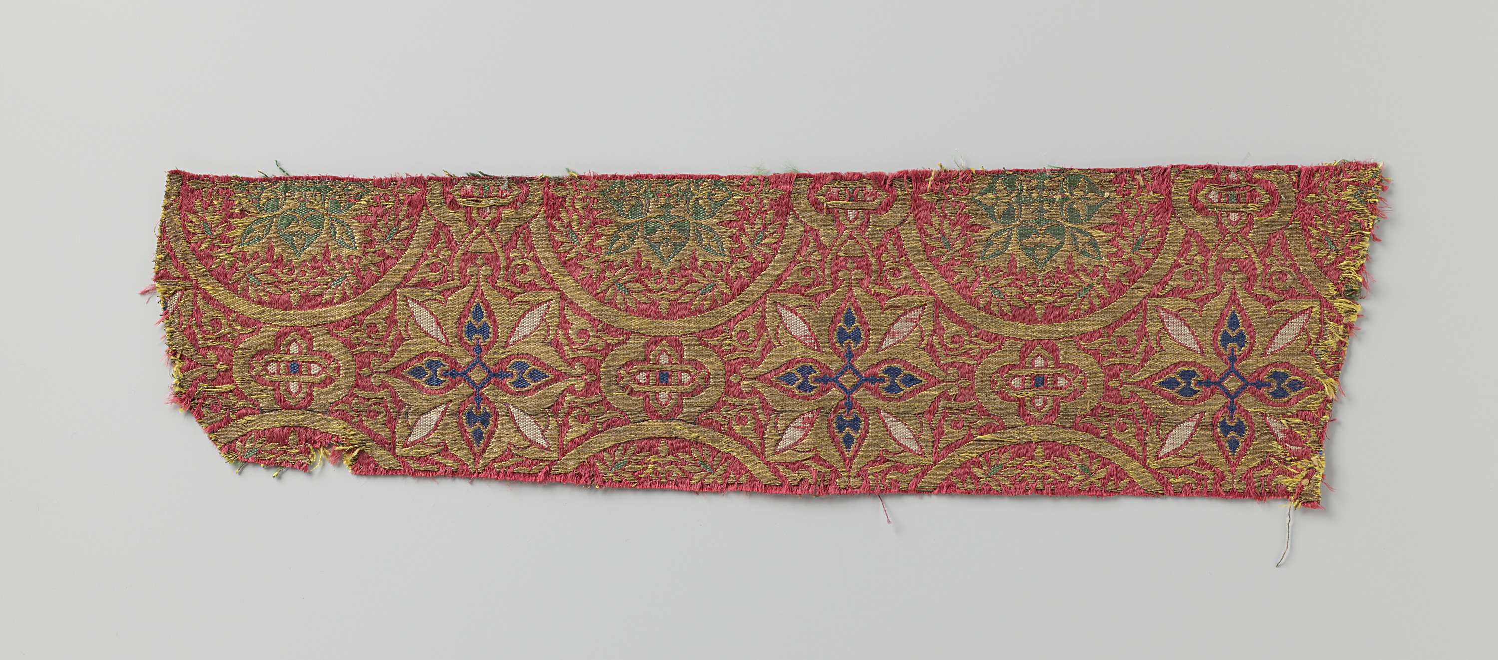 Fragment rode lampas met in blauw, wit, geel en goud...