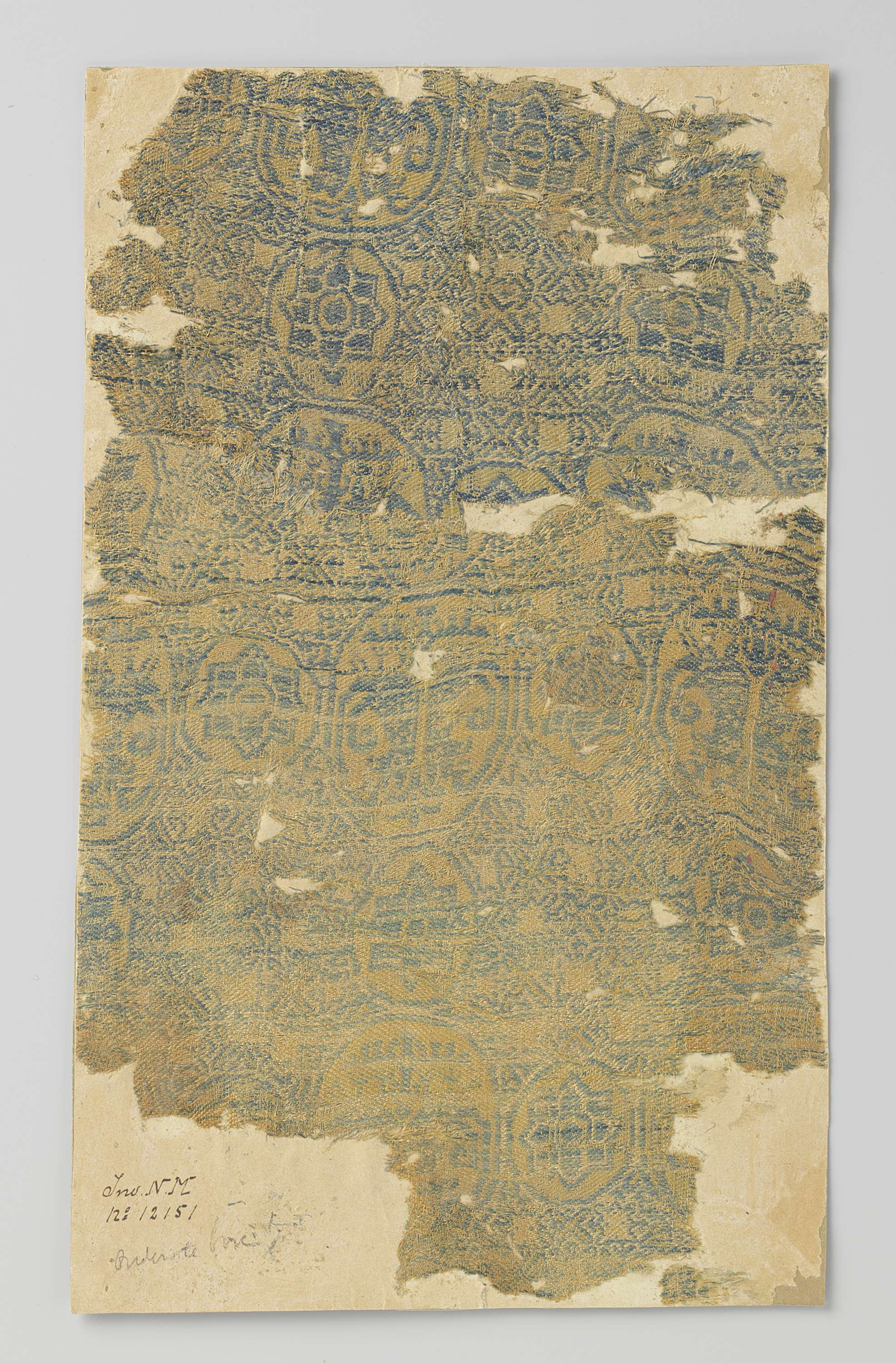 Fragment geel samiet met blauw en wit patroon van ci...