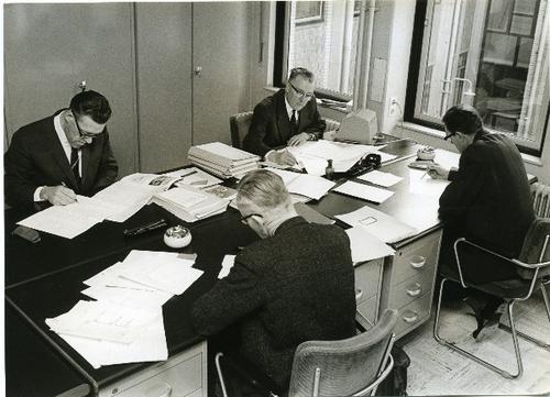 Foto in zwart-wit van het kantoor van de Bond van Co...