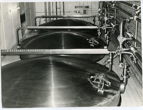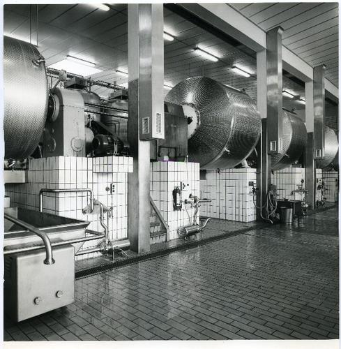Foto in zwart-wit van ketels in een zuivelfabriek do...
