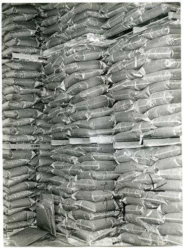 Foto in zwart-wit van de opslag van zakken melkpoede...