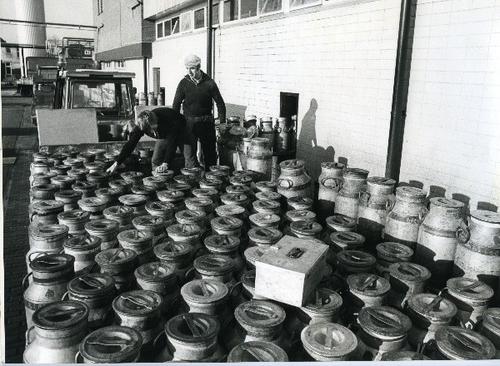 Foto in zwart-wit van de ontvangst van melkbussen bi...