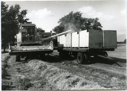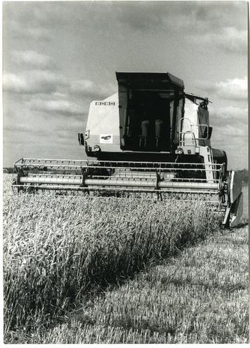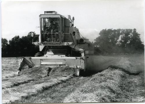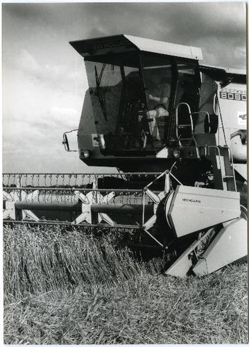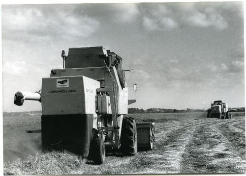Foto in zwart-wit van een maaidorser merk New Hollan...