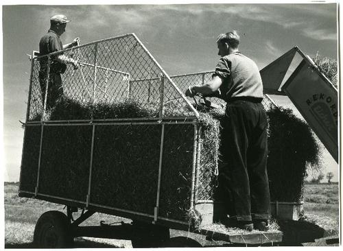 Foto in zwart-wit van een platte wagen met hooi door...