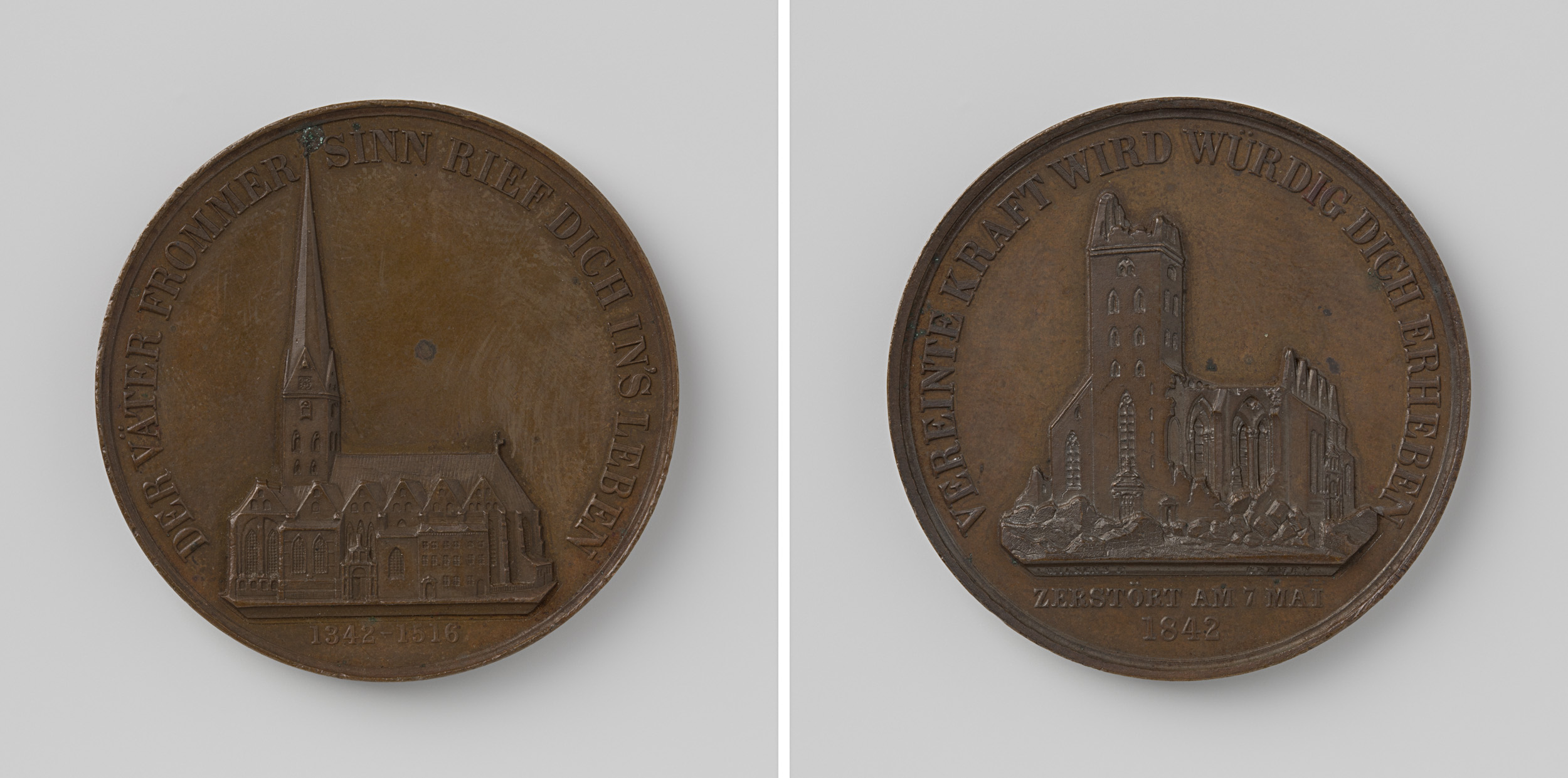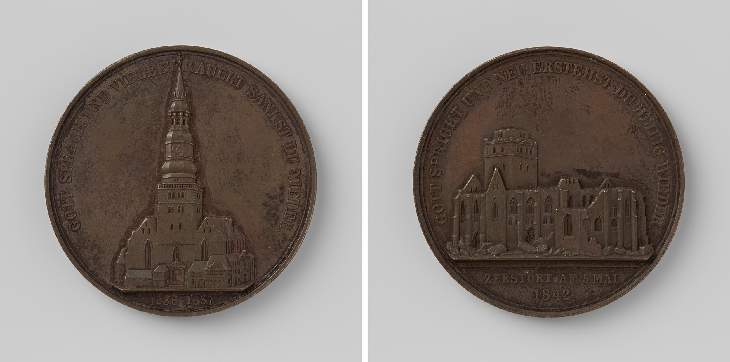 Brand van de Nicolaikerk te Hamburg, penning geslage...