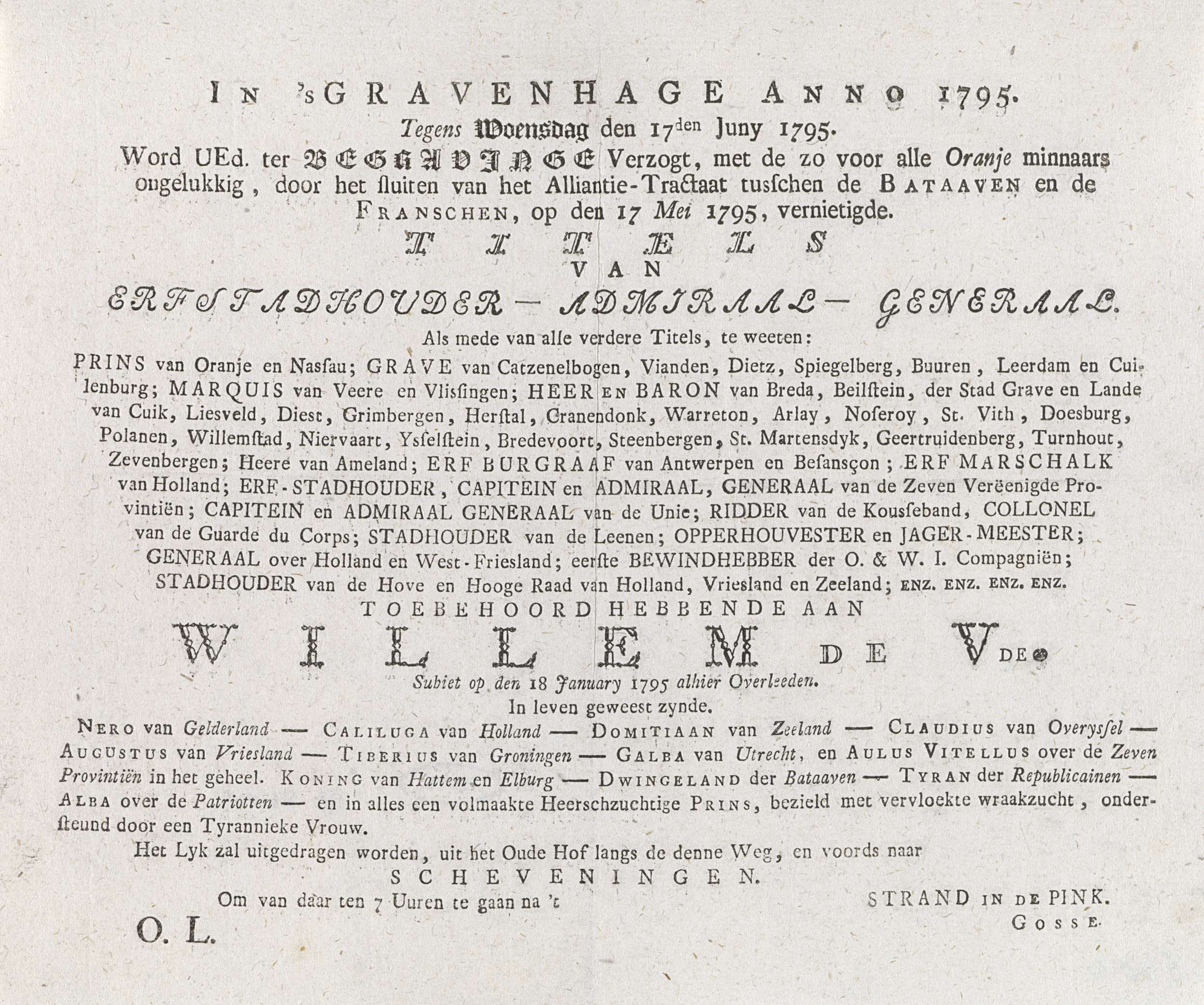Begrafenisbriefje van de titels van de prins van Ora...