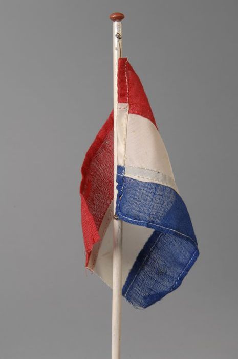 Miniatuur rood-wit-blauwe vlag aan witte stok, boven...