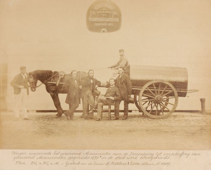 Foto van zes mannen bij rijdende watertank van de "V...