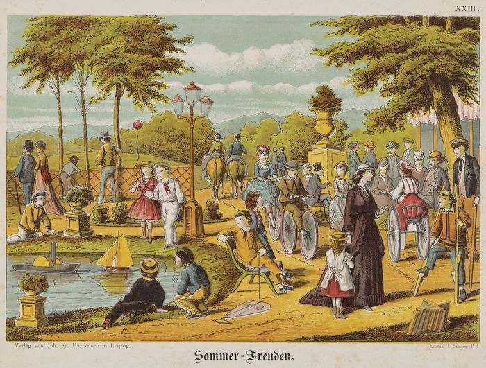 Plakplaat met voorstelling van park met veel wandele...