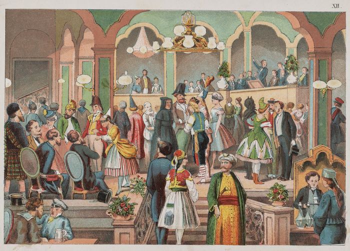 Plakplaat met voorstelling van gekostumeerd bal
