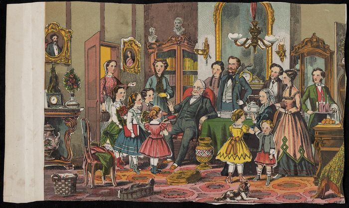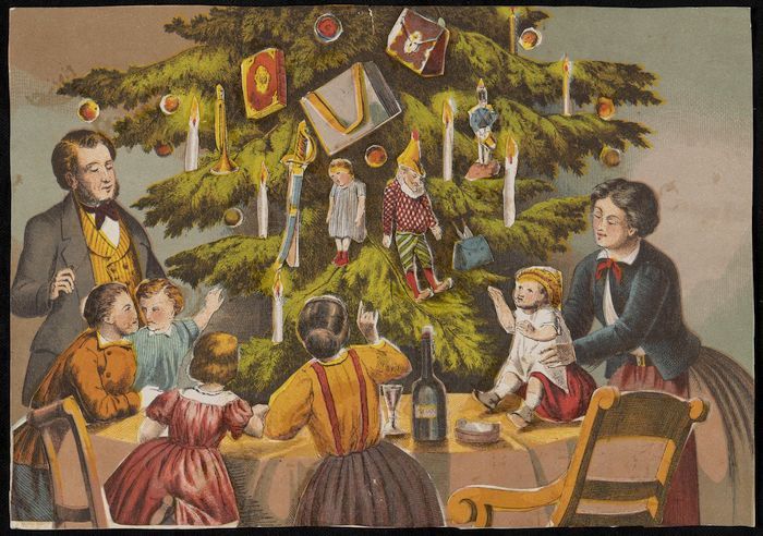 Plakplaat met voorstelling van gezin rond kerstboom ...