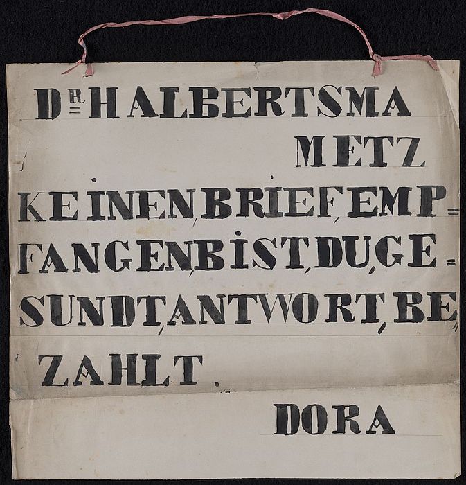 Papieren vel met ophanglint en in inkt geschreven: "...