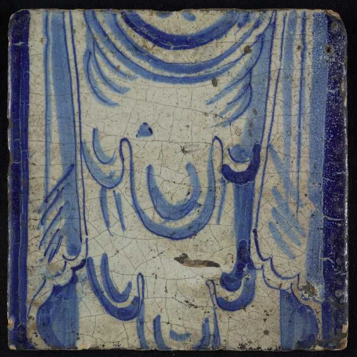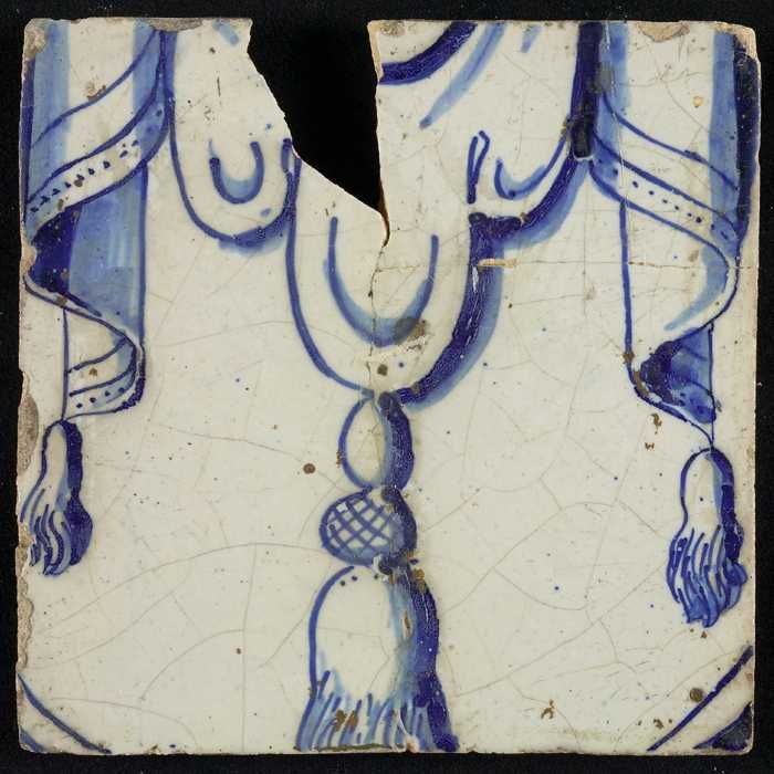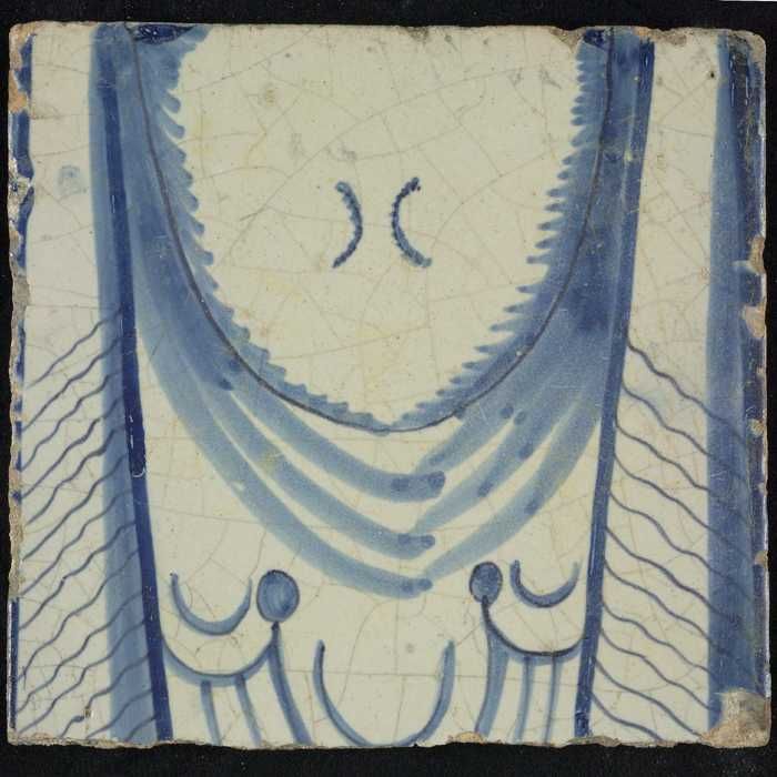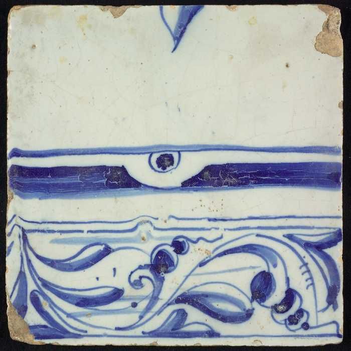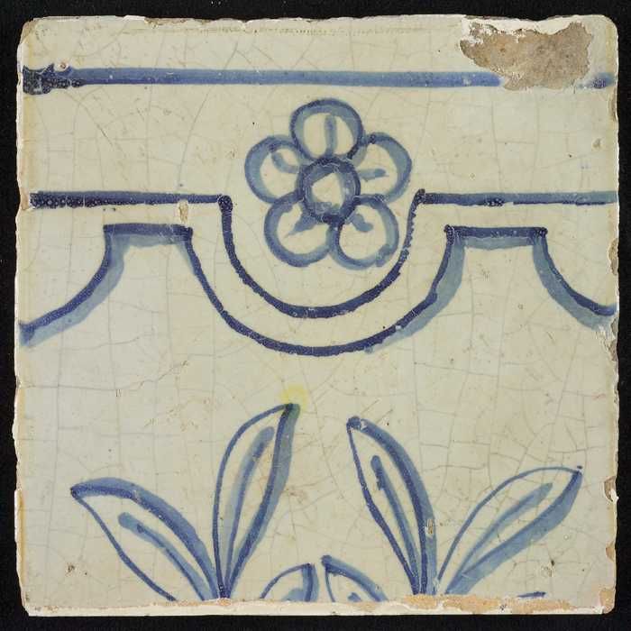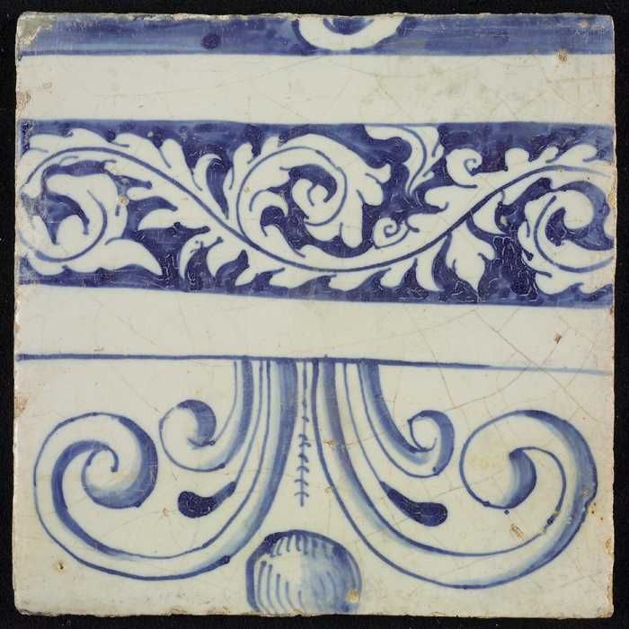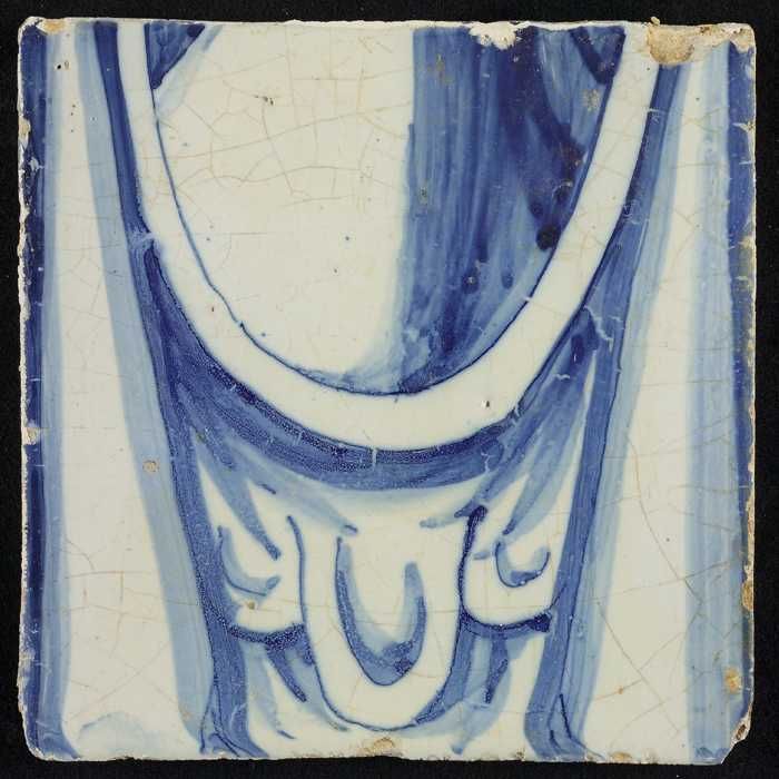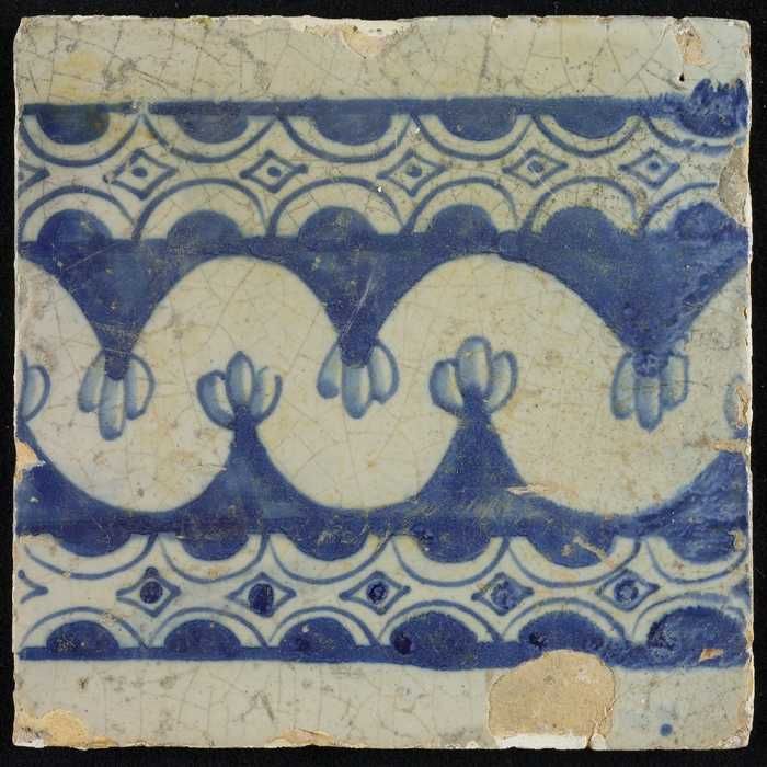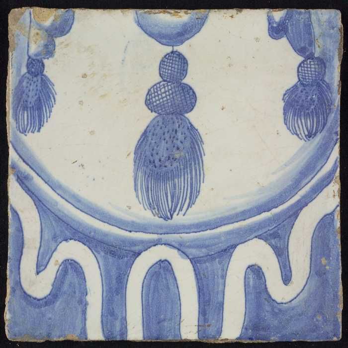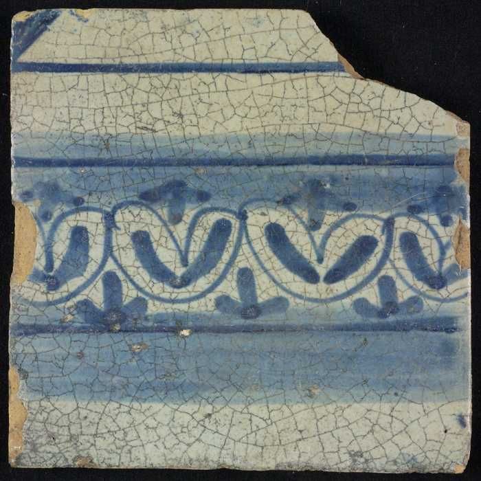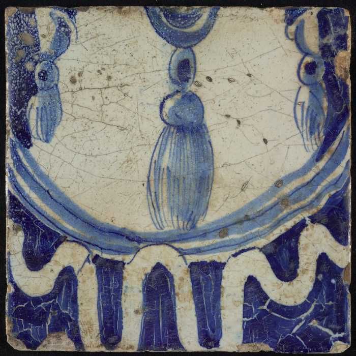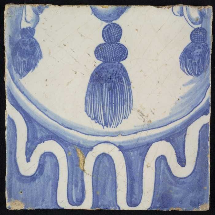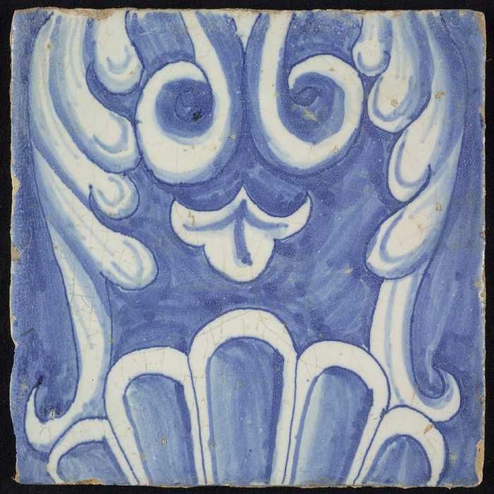 Tegel, blauw op wit, rand met schulpen en franjes