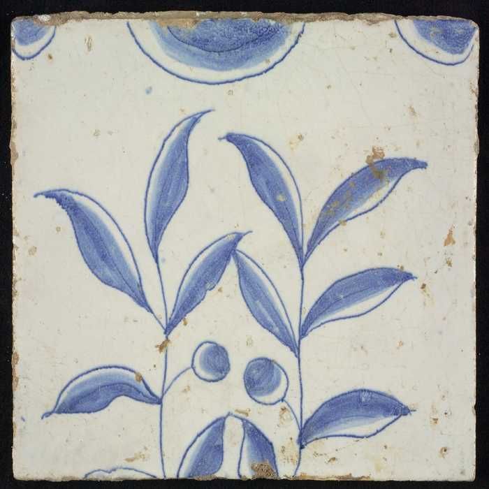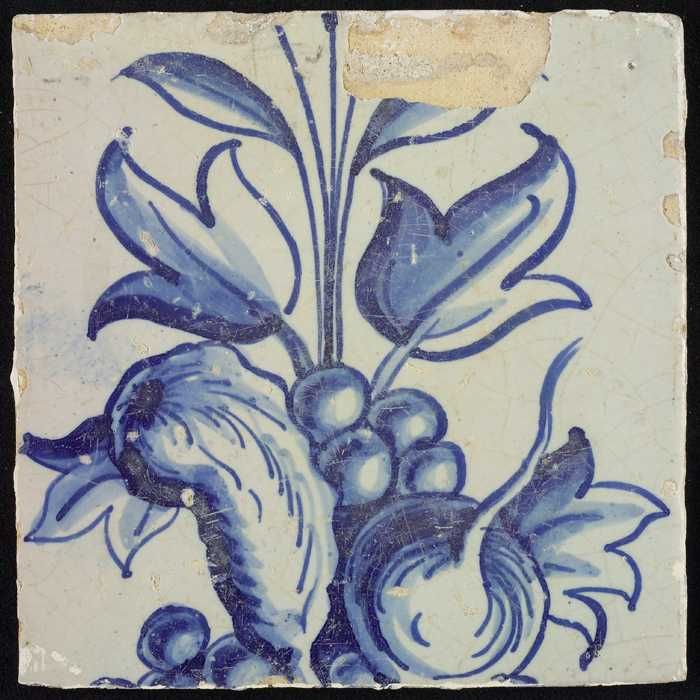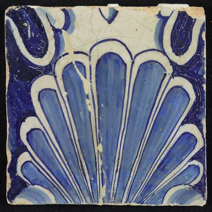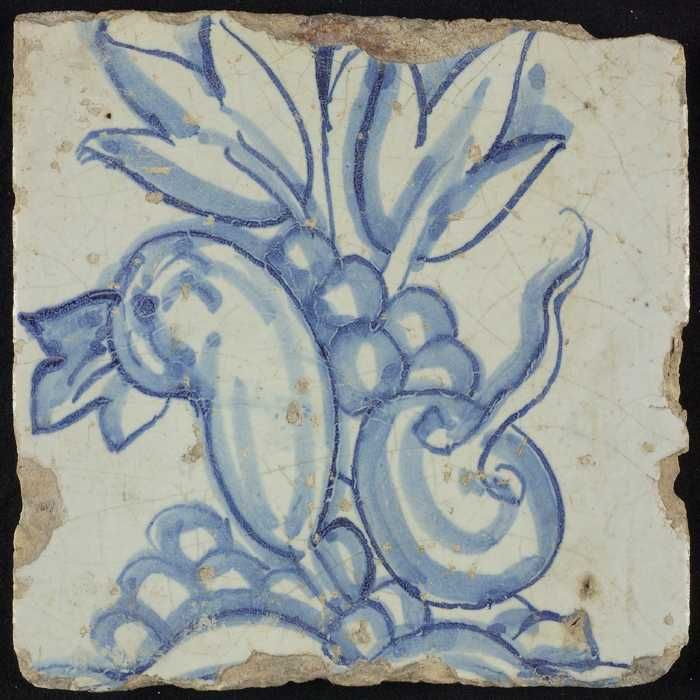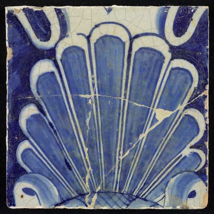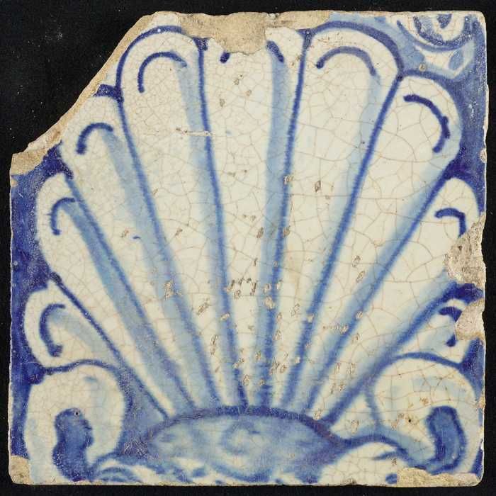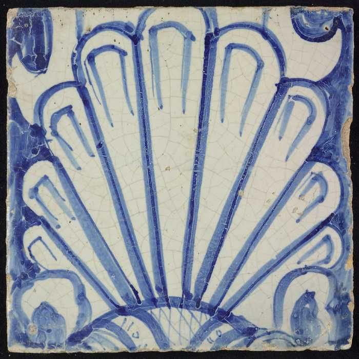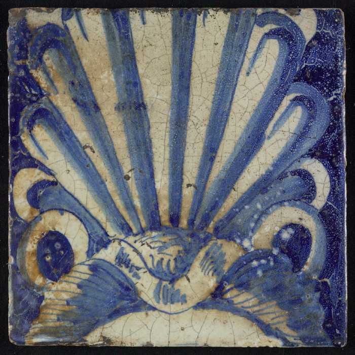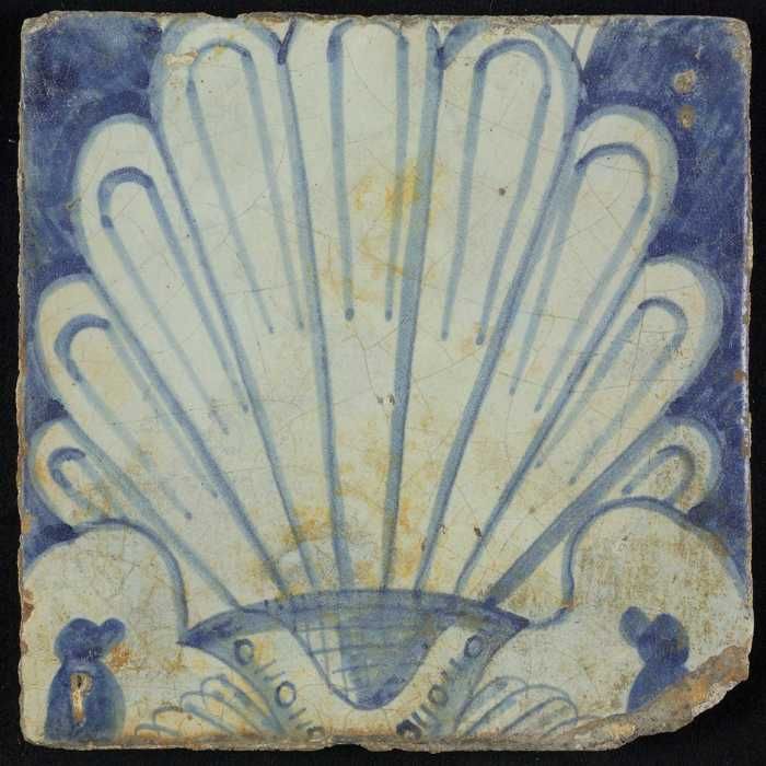 Tegel, blauw op wit, rand met schulpen waarin centra...