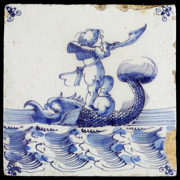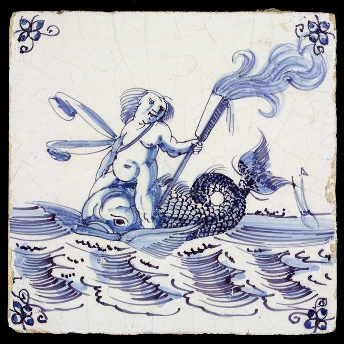 Tafereeltegel, figuur zittend op de rug van een vis,...