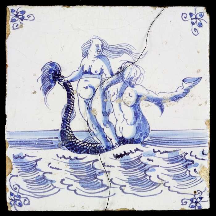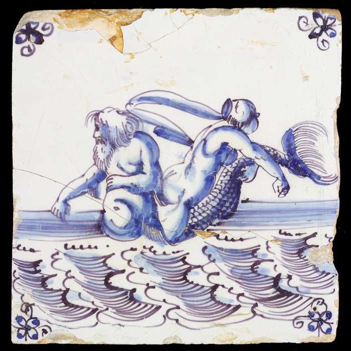 Tafereeltegel, meerman met hoorn met naakte vrouw op...