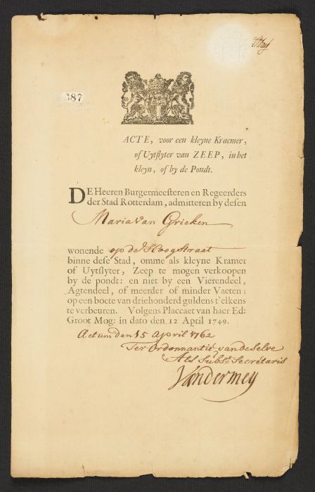 Vergunning voor Maria van Grieken voor verkoop van zeep