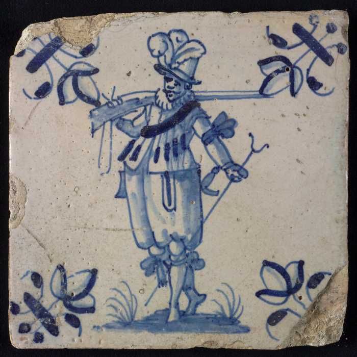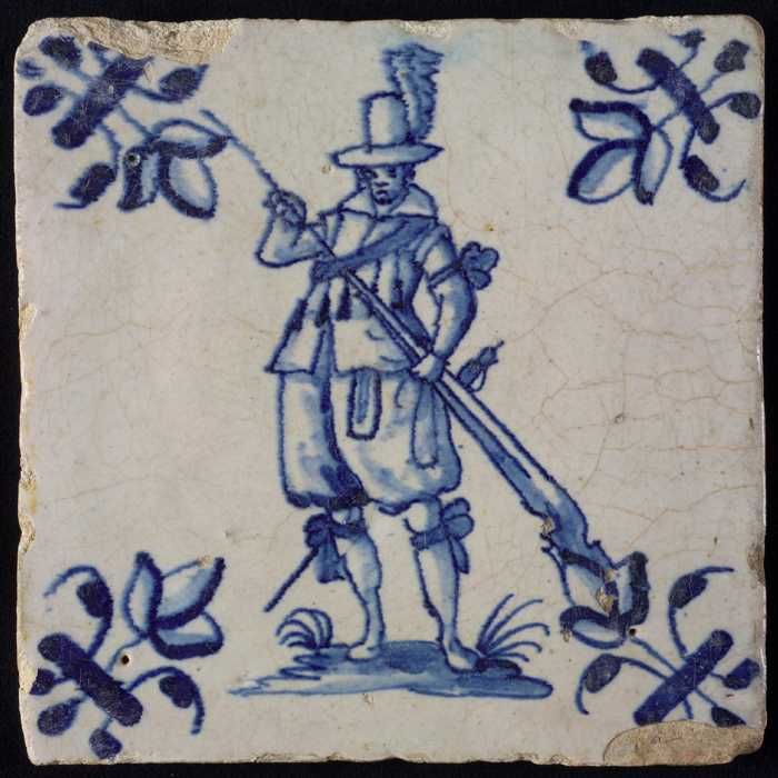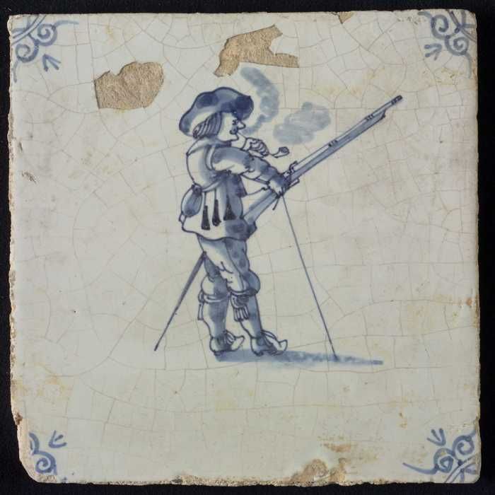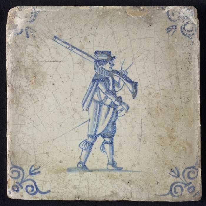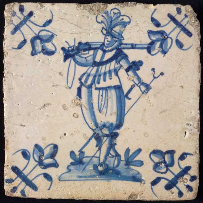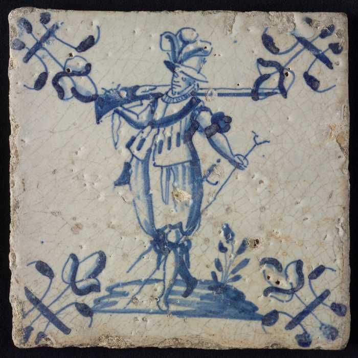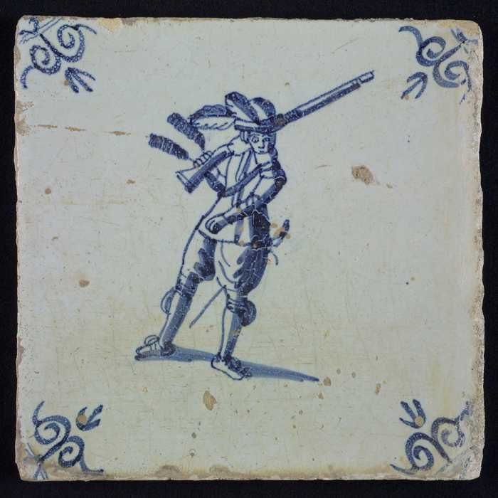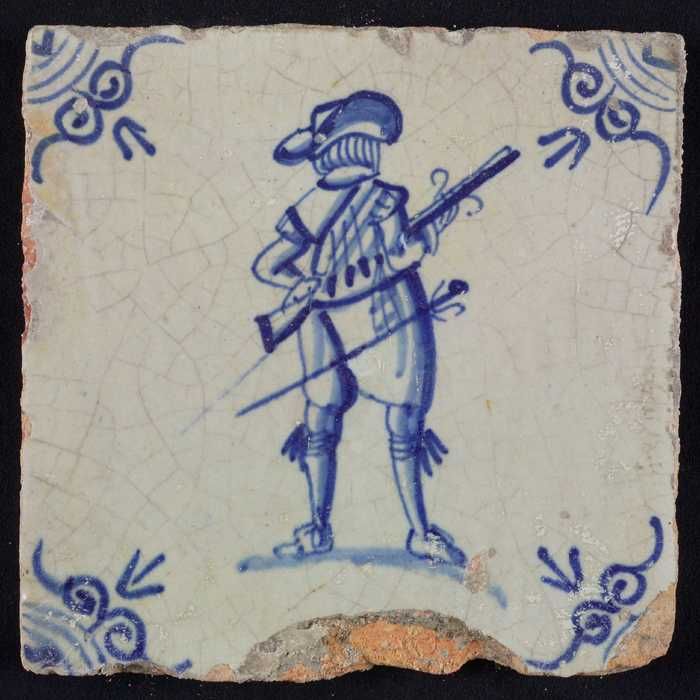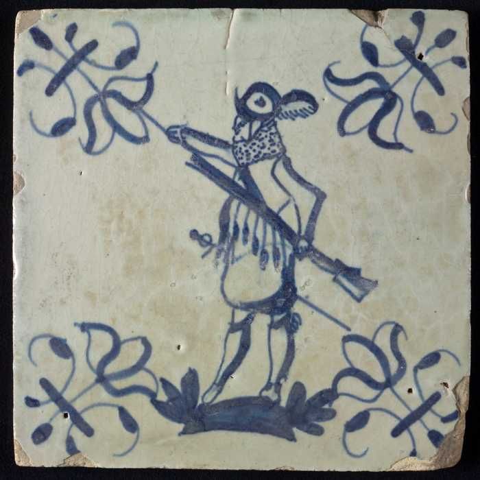Figuurtegel, krijgsman met musket, hoekmotief ossenkop