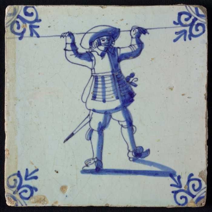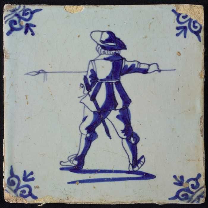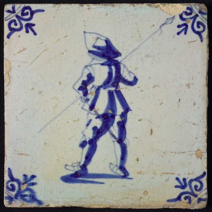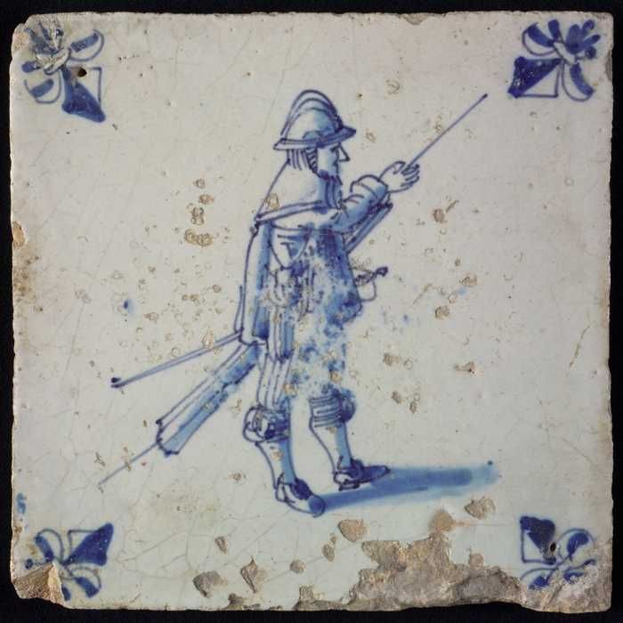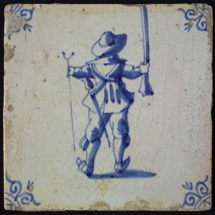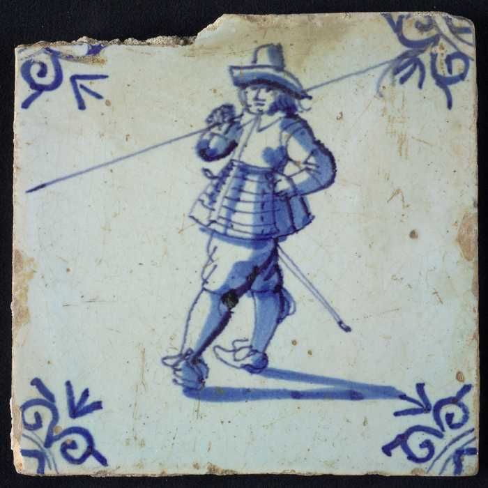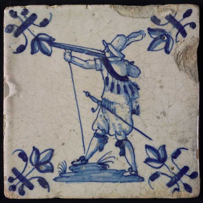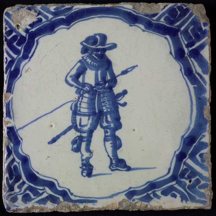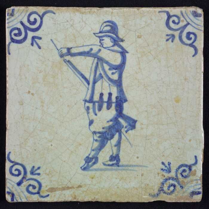 Figuurtegel, krijgsman met musket, hoekmotief ossenkop