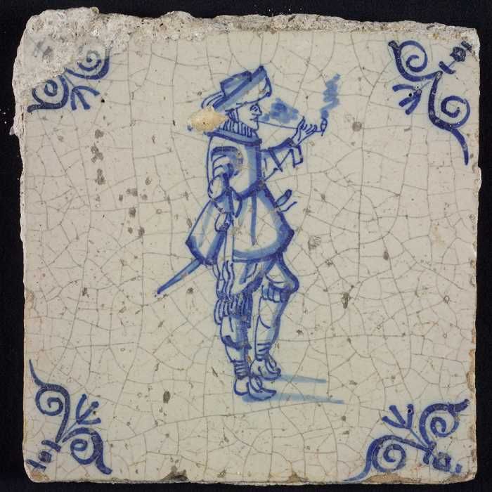 Figuurtegel, pijprokende krijgsman, twee tinten blau...