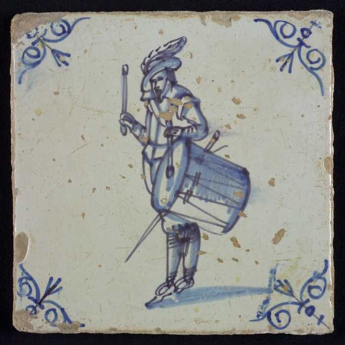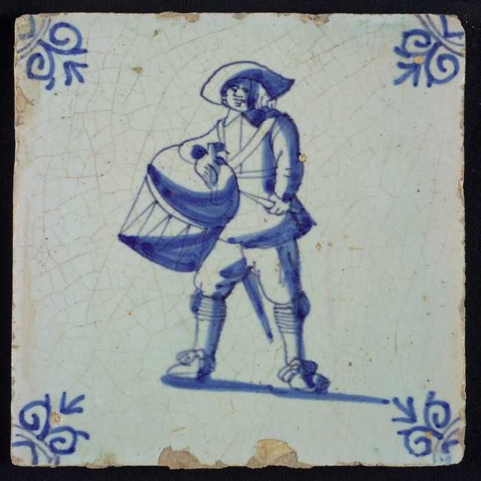 Figuurtegel, trommelende krijgsman, twee tinten blau...