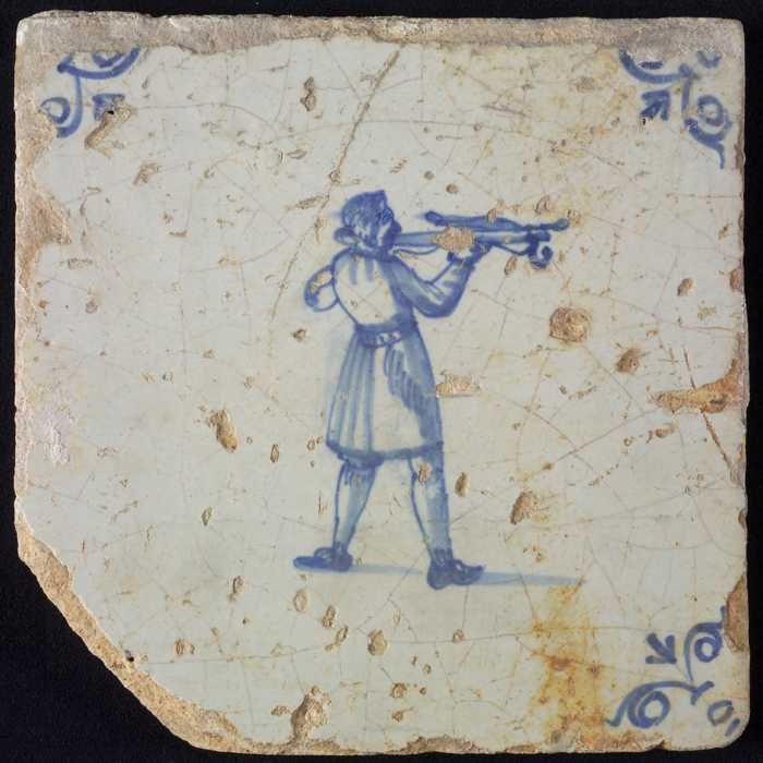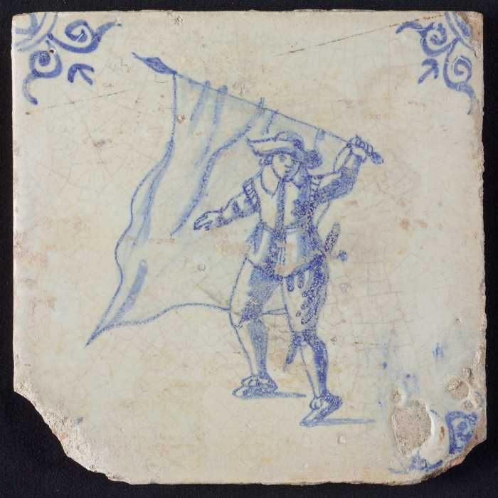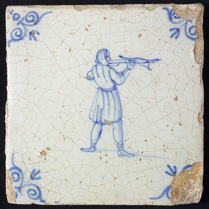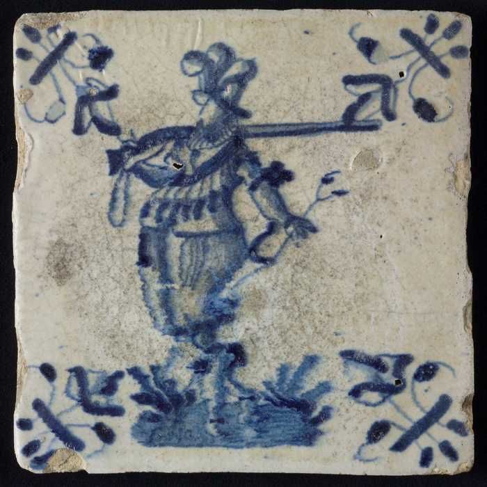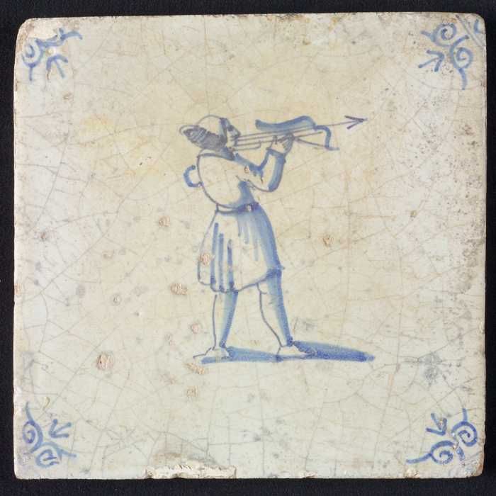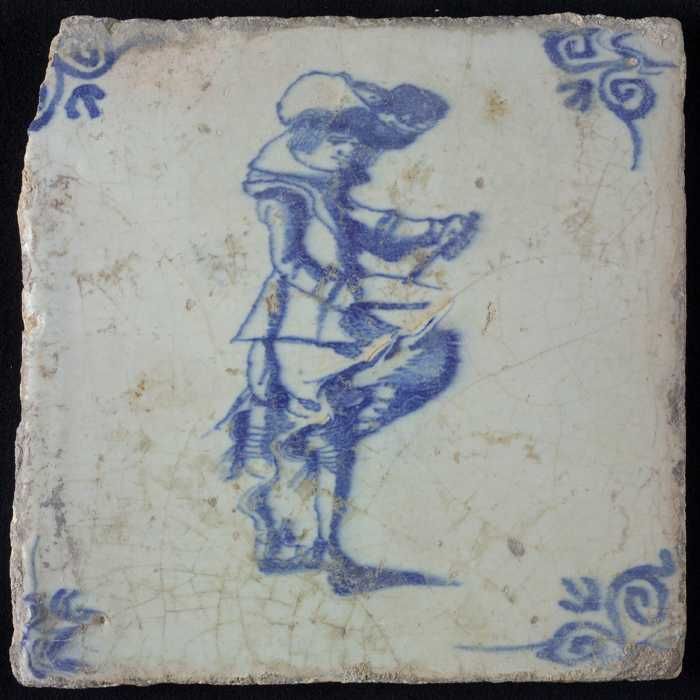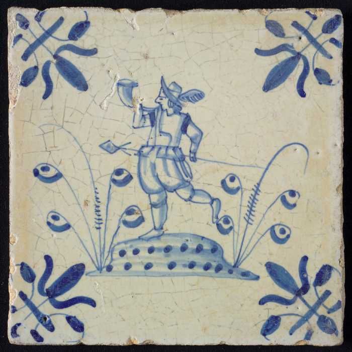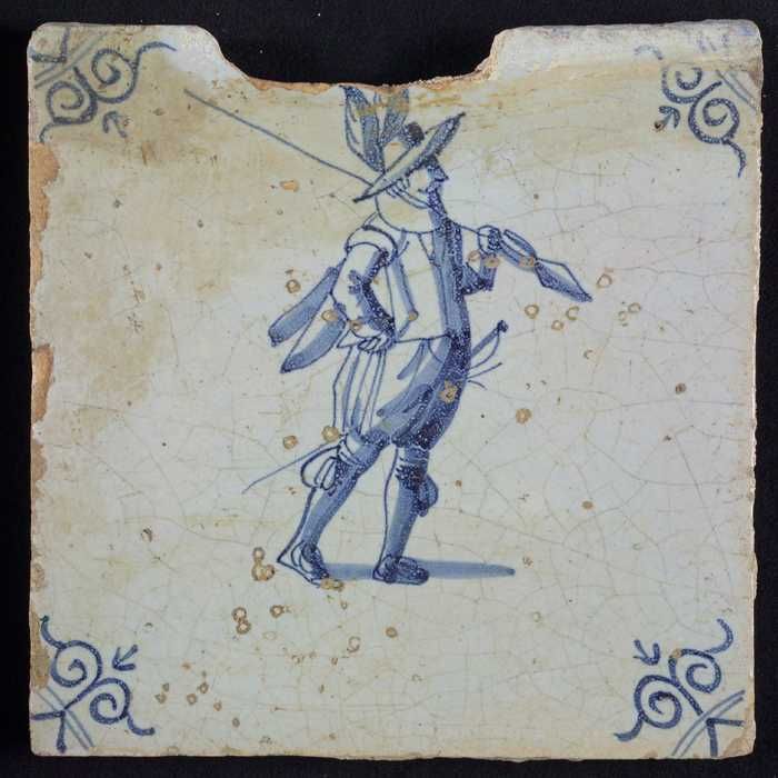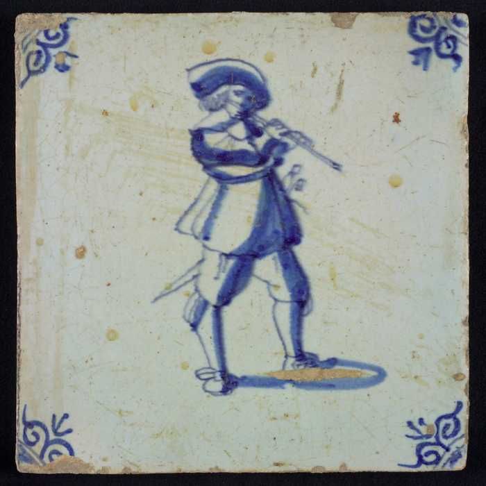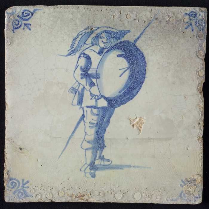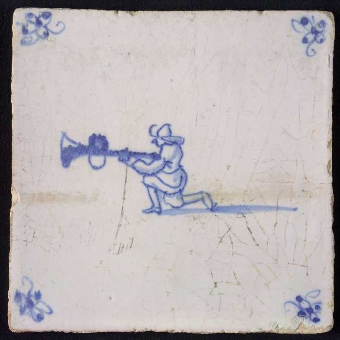 Figuurtegel, fluitspelende krijgsman, hoekmotief oss...