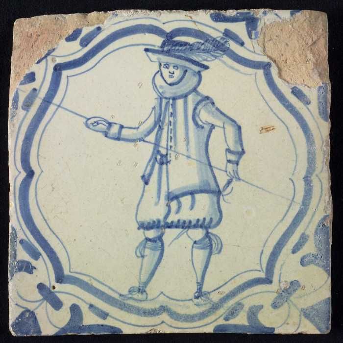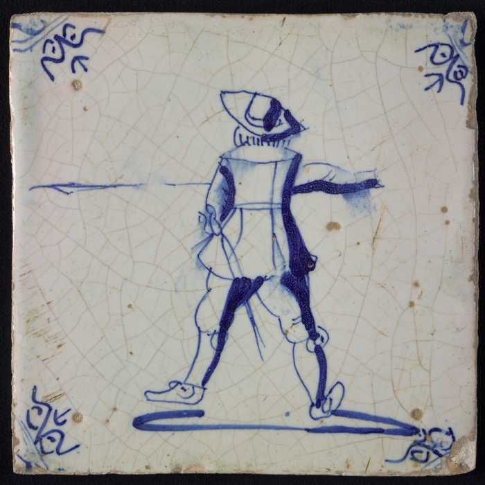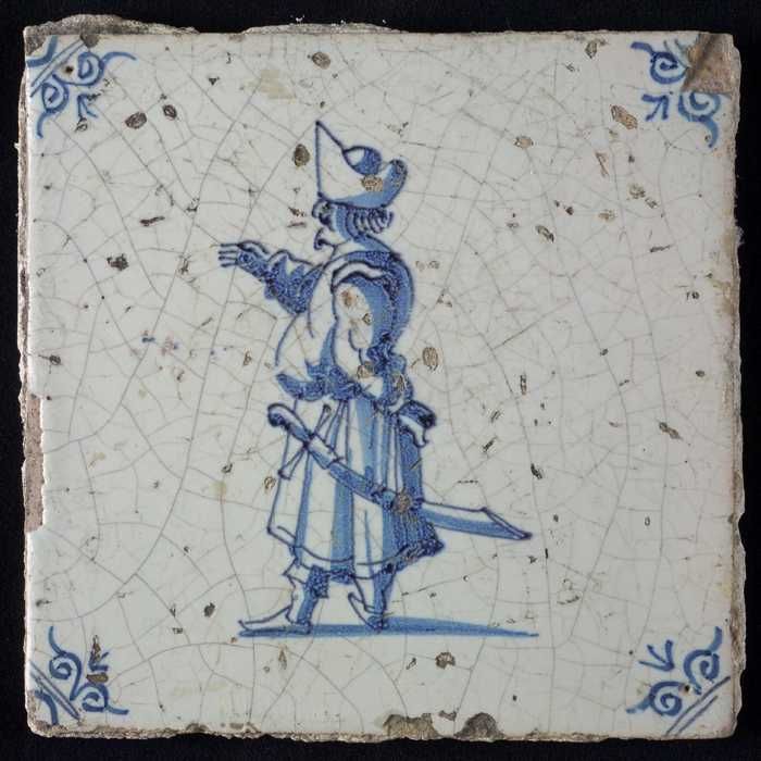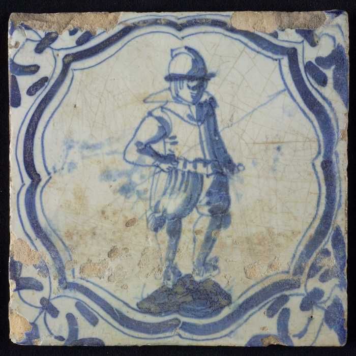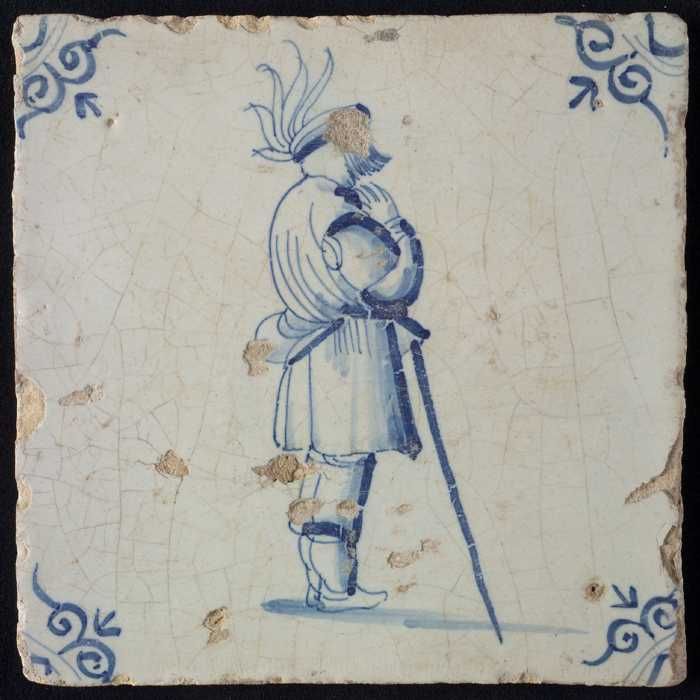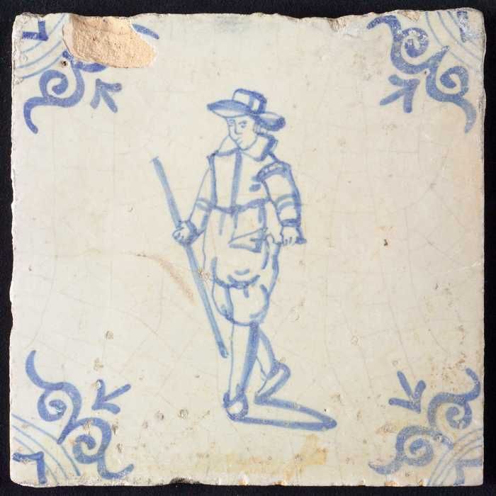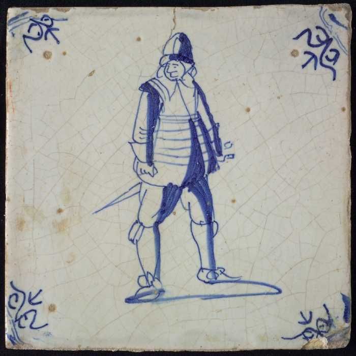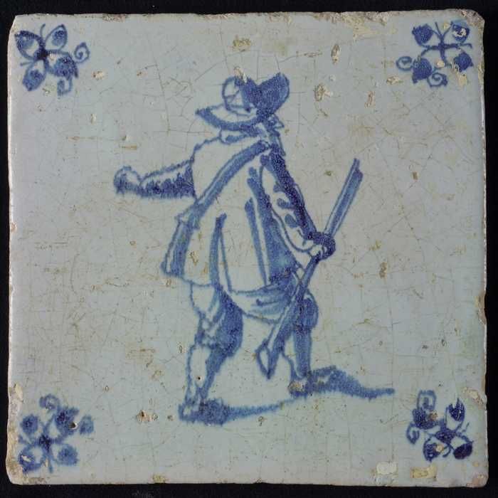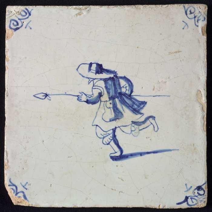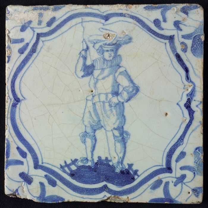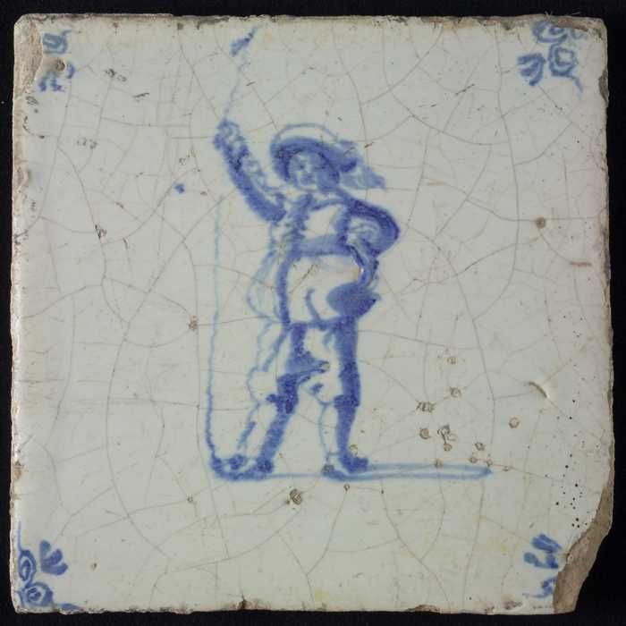 Figuurtegel, fluitspelende krijgsman, hoekmotief oss...